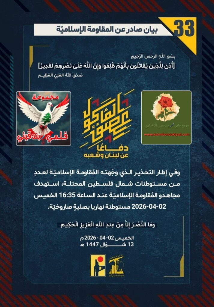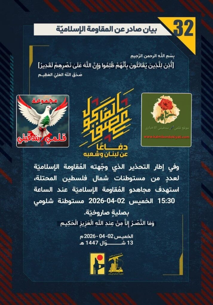 ๐Ÿ›‘ ุจูŠุงู† ุฑู‚ู… (29) ู„ู„ู…ู‚ุงูˆู…ุฉ ุงู„ุฅุณู„ุงู…ูŠุฉ ุงู„ุขุชูŠ ู†ุตู‡: “ุจููƒู…ูŠู†ู ู…ูุญูƒู… ูˆุฑุตุฏู ุฏู‚ูŠู‚ ู„ู€ ุฃุจู†ุงุก ู†ุตุฑ ุงู„ู„ู‡ุŒ ุงู†ู‚ุถู‘ุช ู…ูุญู„ู‘ู‚ุฉ ุงู†ู‚ุถุงุถูŠู‘ุฉ ุนู†ุฏ ุงู„ุณุงุนุฉ 15:15 ุงู„ุฎู…ูŠุณ 02-04-2026 ุนู„ู‰ ู‚ูˆู‘ุฉ ุตู‡ูŠูˆู†ูŠู‘ุฉ ุชุญุตู‘ู†ุช ุฏุงุฎู„ ู…ู†ุฒู„ ููŠ ุงู„ุจูŠู‘ุงุถุฉ.. ุญู‚ู‚ู†ุง ุงู„ุฅุตุงุจุฉ ุงู„ู…ุจุงุดุฑุฉ ููŠ ุฑุคูˆุณ ู†ูุฎุจุชูƒู…!”