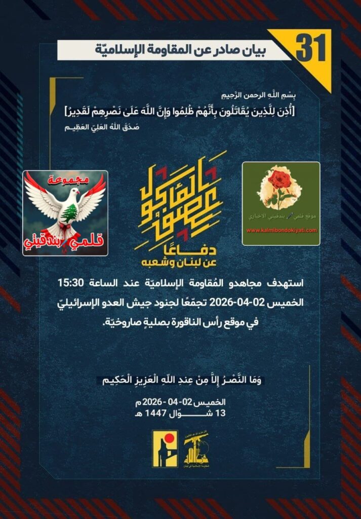 ๐Ÿ›‘ ุจูŠุงู† ุฑู‚ู… (31) ู„ู„ู…ู‚ุงูˆู…ุฉ ุงู„ุฅุณู„ุงู…ูŠุฉ ุงู„ุขุชูŠ ู†ุตู‡: “ุชุญุชูŽ ุฃู‚ุฏุงู…ู ุงู„ุฌุจุงุจุฑุฉ ุชู‡ุงูˆุช ุบุทุฑุณุชูƒู….. ุงุณุชู‡ุฏููŽ ุฃุจู†ุงุก ู†ุตุฑ ุงู„ู„ู‡ ุนู†ุฏ ุงู„ุณุงุนุฉ 15:30 ุงู„ุฎู…ูŠุณ ุชุฌู…ู‘ุนุงู‹ ู„ุฌู†ูˆุฏ ุงู„ุนุฏูˆ ููŠ ู…ูˆู‚ุน ุฑุฃุณ ุงู„ู†ุงู‚ูˆุฑุฉ ุจุตู„ูŠุฉู ุตุงุฑูˆุฎูŠู‘ุฉ.. ุงู„ู…ูˆุชู ูŠู„ุงุญู‚ูƒู… ููŠ ูƒู„ู‘ ุดุจุฑ!”
