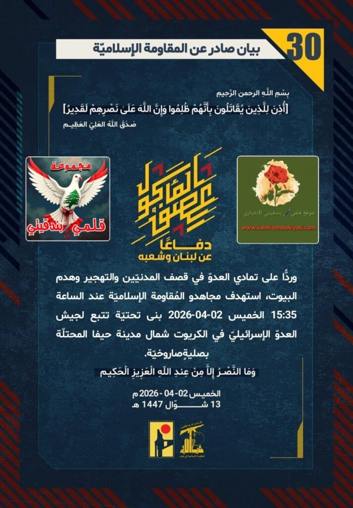 ๐Ÿ›‘ ุจูŠุงู† ุฑู‚ู… (30) ู„ู„ู…ู‚ุงูˆู…ุฉ ุงู„ุฅุณู„ุงู…ูŠุฉ ุงู„ุขุชูŠ ู†ุตู‡: “ุฑุฏุงู‹ ุนู„ู‰ ุงู„ุชู…ุงุฏูŠ ููŠ ุงุณุชู‡ุฏุงู ุฃู‡ู„ู†ุงุŒ ุฏูƒู‘ูŽ ุฃุจู†ุงุก ู†ุตุฑ ุงู„ู„ู‡ ุนู†ุฏ ุงู„ุณุงุนุฉ 15:35 ุงู„ุฎู…ูŠุณ ุงู„ุจู†ู‰ ุงู„ุชุญุชูŠู‘ุฉ ู„ุฌูŠุด ุงู„ุนุฏูˆ ููŠ ุงู„ูƒุฑูŠูˆุช ุจุตู„ูŠุฉู ุตุงุฑูˆุฎูŠู‘ุฉู ู…ุฒู„ุฒู„ุฉ.. ุนู…ู‚ููƒู… ุชุญุชูŽ ุฑุญู…ุฉู ุตูˆุงุฑูŠุฎู†ุง!”