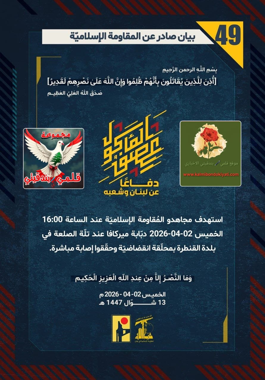 صدر بيان رقم “49” للمقاومة الاسلامية الآتي نصه:”دفاعًا عن لبنان وشعبه، استهدف مجاهدو المُقاومة الإسلاميّة عند الساعة 16:00 الخميس 02-04-2026 دبّابة ميركافا عند تلّة الصلعة في بلدة القنطرة بمحلّقة انقضاضيّة وحقّقوا إصابة مباشرة.