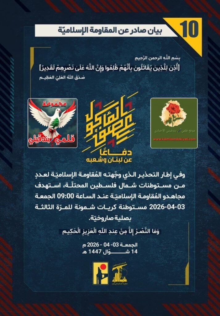 โ๐ ุตุฏุฑ ุจูุงู ุฑูู (10) ููู ูุงูู ุฉ ุงูุฅุณูุงู ูุฉ ุงูุขุชู ูุตู:”ุฏูุงุนูุง ุนู ูุจูุงู ูุดุนุจูุ ููู ุฅุทุงุฑ โุงูุชุญุฐูุฑ ุงูุฐู ูุฌููุชู ุงูู ููุงูู ุฉ ุงูุฅุณูุงู ููุฉ ูุนุฏุฏู ู ู ู ุณุชูุทูุงุช ุดู ุงู ููุณุทูู ุงูู ุญุชููุฉุ ุงุณุชูุฏู ู ุฌุงูุฏู ุงูู ููุงูู ุฉ ุงูุฅุณูุงู ููุฉ ุนูุฏ ุงูุณุงุนุฉ 09:00 ุงูุฌู ุนุฉ 03-04-2026 ู ุณุชูุทูุฉ ูุฑูุงุช ุดู ููุฉ ููู ุฑูุฉ ุงูุซุงูุซุฉ ุจุตููุฉ ุตุงุฑูุฎููุฉ.”