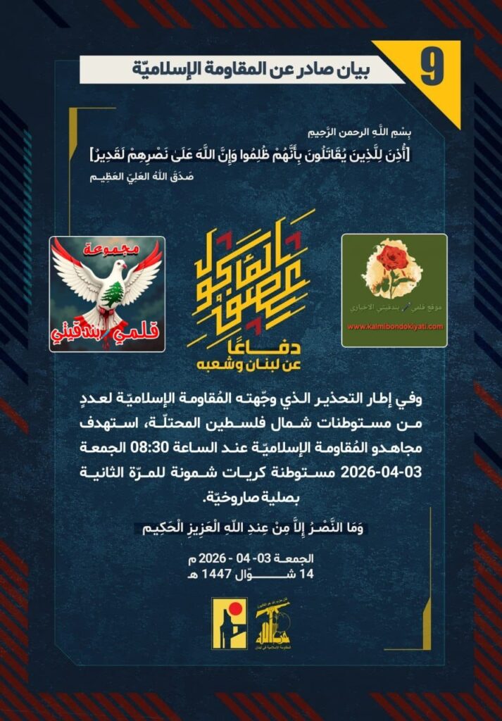 โ๐ ุตุฏุฑ ุจูุงู ุฑูู (9) ููู ูุงูู ุฉ ุงูุฅุณูุงู ูุฉ ุงูุขุชู ูุตู:”ุฏูุงุนูุง ุนู ูุจูุงู ูุดุนุจูุ ููู ุฅุทุงุฑ โุงูุชุญุฐูุฑ ุงูุฐู ูุฌููุชู ุงูู ููุงูู ุฉ ุงูุฅุณูุงู ููุฉ ูุนุฏุฏู ู ู ู ุณุชูุทูุงุช ุดู ุงู ููุณุทูู ุงูู ุญุชููุฉุ ุงุณุชูุฏู ู ุฌุงูุฏู ุงูู ููุงูู ุฉ ุงูุฅุณูุงู ููุฉ ุนูุฏ ุงูุณุงุนุฉ 08:30 ุงูุฌู ุนุฉ 03-04-2026 ู ุณุชูุทูุฉ ูุฑูุงุช ุดู ููุฉ ููู ุฑูุฉ ุงูุซุงููุฉ ุจุตููุฉ ุตุงุฑูุฎููุฉ.”