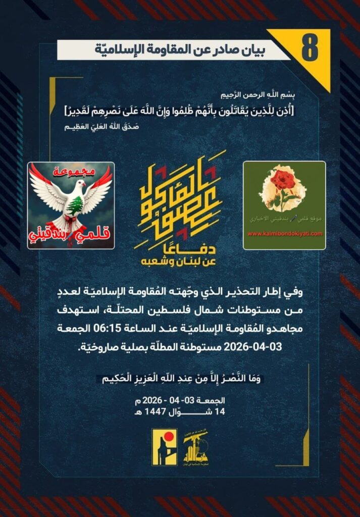 โ๐ ุตุฏุฑ ุจูุงู ุฑูู (8) ููู ูุงูู ุฉ ุงูุฅุณูุงู ูุฉ ุงูุขุชู ูุตู:”ุฏูุงุนูุง ุนู ูุจูุงู ูุดุนุจูุ ููู ุฅุทุงุฑ โุงูุชุญุฐูุฑ ุงูุฐู ูุฌููุชู ุงูู ููุงูู ุฉ ุงูุฅุณูุงู ููุฉ ูุนุฏุฏู ู ู ู ุณุชูุทูุงุช ุดู ุงู ููุณุทูู ุงูู ุญุชููุฉุ ุงุณุชูุฏู ู ุฌุงูุฏู ุงูู ููุงูู ุฉ ุงูุฅุณูุงู ููุฉ ุนูุฏ ุงูุณุงุนุฉ 08:00 ุงูุฌู ุนุฉ 03-04-2026 ู ุณุชูุทูุฉ ุงูู ุทููุฉ ุจุตููุฉ ุตุงุฑูุฎููุฉ.”