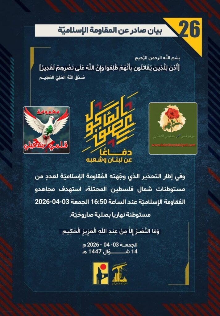 โ๐ ุตุฏุฑ ุจูุงู ุฑูู (26) ููู ูุงูู ุฉ ุงูุฅุณูุงู ูุฉ ุงูุขุชู ูุตู:”ุฏูุงุนูุง ุนู ูุจูุงู ูุดุนุจูุ ููู ุฅุทุงุฑ โุงูุชุญุฐูุฑ ุงูุฐู ูุฌููุชู ุงูู ููุงูู ุฉ ุงูุฅุณูุงู ููุฉ ูุนุฏุฏู ู ู ู ุณุชูุทูุงุช ุดู ุงู ููุณุทูู ุงูู ุญุชูุฉุ ุงุณุชูุฏู ู ุฌุงูุฏู ุงูู ููุงูู ุฉ ุงูุฅุณูุงู ููุฉ ุนูุฏ ุงูุณุงุนุฉ 16:50 ุงูุฌู ุนุฉ 03-04-2026 ู ุณุชูุทูุฉ ููุงุฑูุง ุจุตููุฉ ุตุงุฑูุฎููุฉ.”