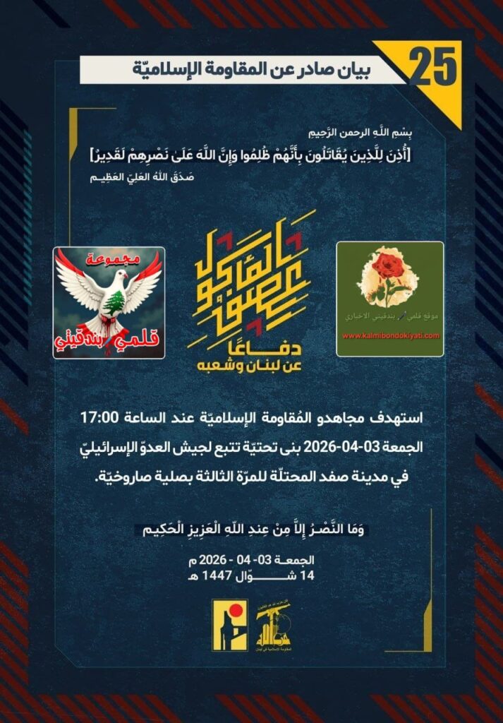 โ๐ ุตุฏุฑ ุจูุงู ุฑูู (25) ููู ูุงูู ุฉ ุงูุฅุณูุงู ูุฉ ุงูุขุชู ูุตู:”ุฏูุงุนูุง ุนู ูุจูุงู ูุดุนุจูุ ุงุณุชูุฏู ู ุฌุงูุฏู ุงูู ููุงูู ุฉ ุงูุฅุณูุงู ููุฉ ุนูุฏ ุงูุณุงุนุฉ 17:00 ุงูุฌู ุนุฉ 03-04-2026 ุจูู ุชุญุชููุฉ ุชุชุจุน ูุฌูุด ุงูุนุฏูู ุงูุฅุณุฑุงุฆูููู ูู ู ุฏููุฉ ุตูุฏ ุงูู ุญุชููุฉ ููู ุฑูุฉ ุงูุซุงูุซุฉ ุจุตููุฉ ุตุงุฑูุฎููุฉ.”
