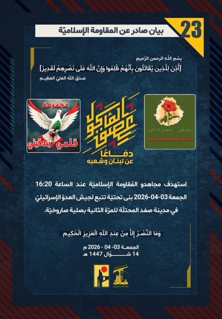 โ๐ ุตุฏุฑ ุจูุงู ุฑูู (23) ููู ูุงูู ุฉ ุงูุฅุณูุงู ูุฉ ุงูุขุชู ูุตู:”ุฏูุงุนูุง ุนู ูุจูุงู ูุดุนุจูุ ุงุณุชูุฏู ู ุฌุงูุฏู ุงูู ููุงูู ุฉ ุงูุฅุณูุงู ููุฉ ุนูุฏ ุงูุณุงุนุฉ 16:20 ุงูุฌู ุนุฉ 03-04-2026 ุจูู ุชุญุชููุฉ ุชุชุจุน ูุฌูุด ุงูุนุฏูู ุงูุฅุณุฑุงุฆูููู ูู ู ุฏููุฉ ุตูุฏ ุงูู ุญุชููุฉ ููู ุฑูุฉ ุงูุซุงููุฉ ุจุตููุฉ ุตุงุฑูุฎููุฉ.”