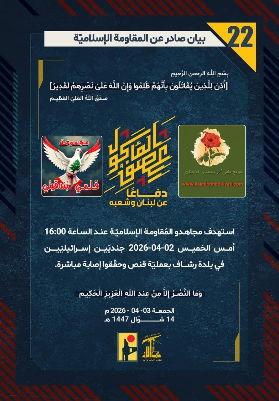 โ๐ ุตุฏุฑ ุจูุงู ุฑูู (22) ููู ูุงูู ุฉ ุงูุฅุณูุงู ูุฉ ุงูุขุชู ูุตู:”ุฏูุงุนูุง ุนู ูุจูุงู ูุดุนุจูุ ุงุณุชูุฏู ู ุฌุงูุฏู ุงูู ููุงูู ุฉ ุงูุฅุณูุงู ููุฉ ุนูุฏ ุงูุณุงุนุฉ 16:00 ุฃู ุณ ุงูุฎู ูุณ 02-04-2026 ุฌูุฏูููู ุฅุณุฑุงุฆูููููู ูู ุจูุฏุฉ ุฑุดุงู ุจุนู ูููุฉ ููุต ูุญููููุง ุฅุตุงุจุฉ ู ุจุงุดุฑุฉ.”