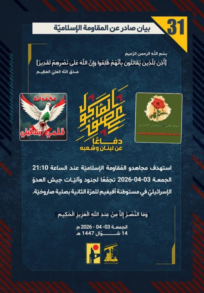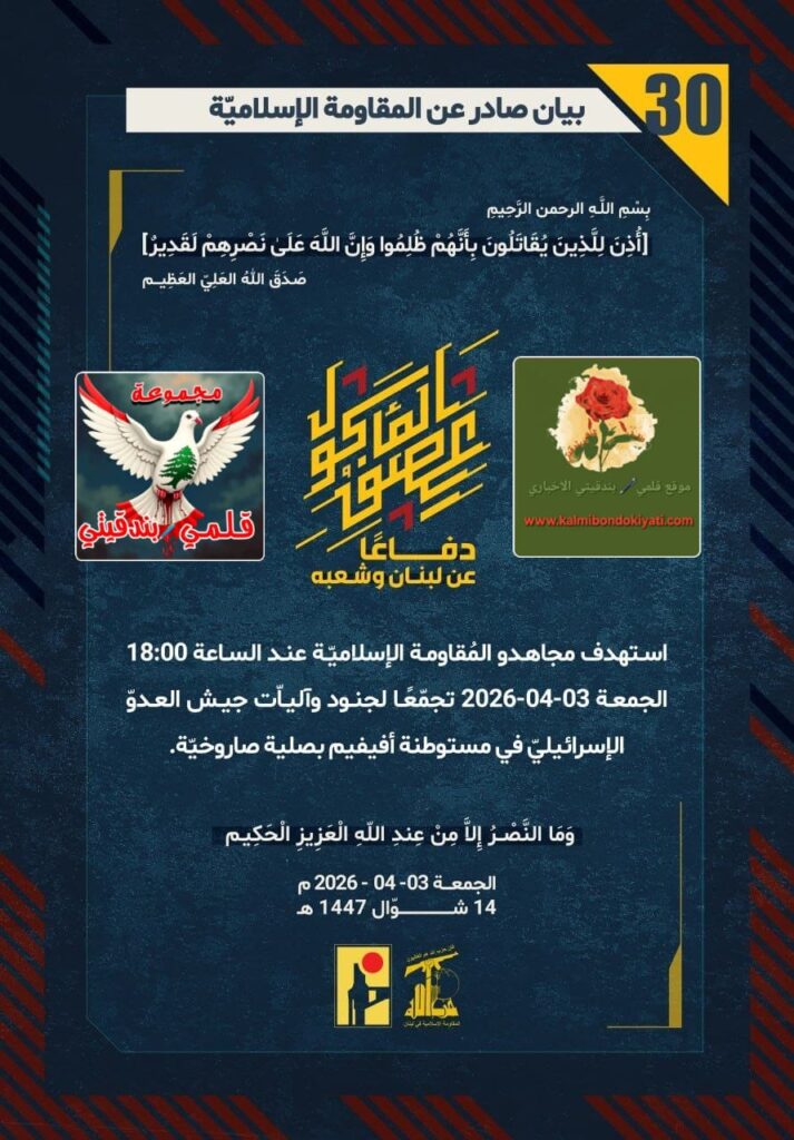 โ๐ ุตุฏุฑ ุจูุงู ุฑูู (30) ููู ูุงูู ุฉ ุงูุฅุณูุงู ูุฉ ุงูุขุชู ูุตู:”ุฏูุงุนูุง ุนู ูุจูุงู ูุดุนุจูุ ุงุณุชูุฏู ู ุฌุงูุฏู ุงูู ููุงูู ุฉ ุงูุฅุณูุงู ููุฉ ุนูุฏ ุงูุณุงุนุฉ 18:00 ุงูุฌู ุนุฉ 03-04-2026 ุชุฌู ูุนูุง ูุฌููุฏ ูุขููุงูุช ุฌูุด ุงูุนุฏูู ุงูุฅุณุฑุงุฆูููู ูู ู ุณุชูุทูุฉ ุฃููููู ุจุตููุฉ ุตุงุฑูุฎููุฉ.”