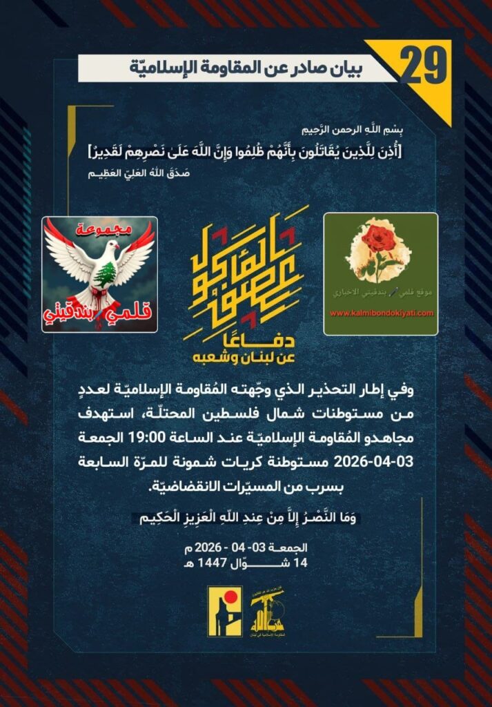 โ๐ ุตุฏุฑ ุจูุงู ุฑูู (29) ููู ูุงูู ุฉ ุงูุฅุณูุงู ูุฉ ุงูุขุชู ูุตู:”ุฏูุงุนูุง ุนู ูุจูุงู ูุดุนุจูุ ููู ุฅุทุงุฑ โุงูุชุญุฐูุฑ ุงูุฐู ูุฌููุชู ุงูู ููุงูู ุฉ ุงูุฅุณูุงู ููุฉ ูุนุฏุฏู ู ู ู ุณุชูุทูุงุช ุดู ุงู ููุณุทูู ุงูู ุญุชููุฉุ ุงุณุชูุฏู ู ุฌุงูุฏู ุงูู ููุงูู ุฉ ุงูุฅุณูุงู ููุฉ ุนูุฏ ุงูุณุงุนุฉ 19:00 ุงูุฌู ุนุฉ 03-04-2026 ู ุณุชูุทูุฉ ูุฑูุงุช ุดู ููุฉ ููู ุฑูุฉ ุงูุณุงุจุนุฉ ุจุณุฑุจ ู ู ุงูู ุณููุฑุงุช ุงูุงููุถุงุถููุฉ.”