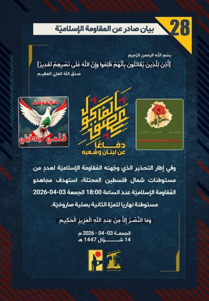 โ๐ ุตุฏุฑ ุจูุงู ุฑูู (28) ููู ูุงูู ุฉ ุงูุฅุณูุงู ูุฉ ุงูุขุชู ูุตู:”ุฏูุงุนูุง ุนู ูุจูุงู ูุดุนุจูุ ููู ุฅุทุงุฑ โุงูุชุญุฐูุฑ ุงูุฐู ูุฌููุชู ุงูู ููุงูู ุฉ ุงูุฅุณูุงู ููุฉ ูุนุฏุฏู ู ู ู ุณุชูุทูุงุช ุดู ุงู ููุณุทูู ุงูู ุญุชูุฉุ ุงุณุชูุฏู ู ุฌุงูุฏู ุงูู ููุงูู ุฉ ุงูุฅุณูุงู ููุฉ ุนูุฏ ุงูุณุงุนุฉ 18:00 ุงูุฌู ุนุฉ 03-04-2026 ู ุณุชูุทูุฉ ููุงุฑูุง ููู ุฑูุฉ ุงูุซุงููุฉ ุจุตููุฉ ุตุงุฑูุฎููุฉ.”