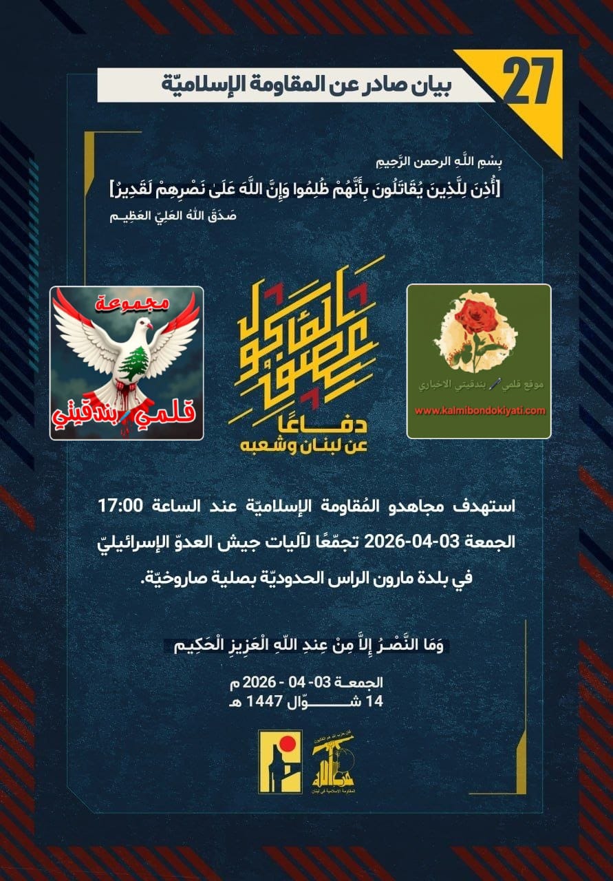 โ๐ ุตุฏุฑ ุจูุงู ุฑูู (27) ููู ูุงูู ุฉ ุงูุฅุณูุงู ูุฉ ุงูุขุชู ูุตู:”ุฏูุงุนูุง ุนู ูุจูุงู ูุดุนุจูุ ุงุณุชูุฏู ู ุฌุงูุฏู ุงูู ููุงูู ุฉ ุงูุฅุณูุงู ููุฉ ุนูุฏ ุงูุณุงุนุฉ 17:00 ุงูุฌู ุนุฉ 03-04-2026 ุชุฌู ูุนูุง ูุขููุงุช ุฌูุด ุงูุนุฏูู ุงูุฅุณุฑุงุฆูููู ูู ุจูุฏุฉ ู ุงุฑูู ุงูุฑุงุณ ุงูุญุฏูุฏููุฉ ุจุตููุฉ ุตุงุฑูุฎููุฉ.”