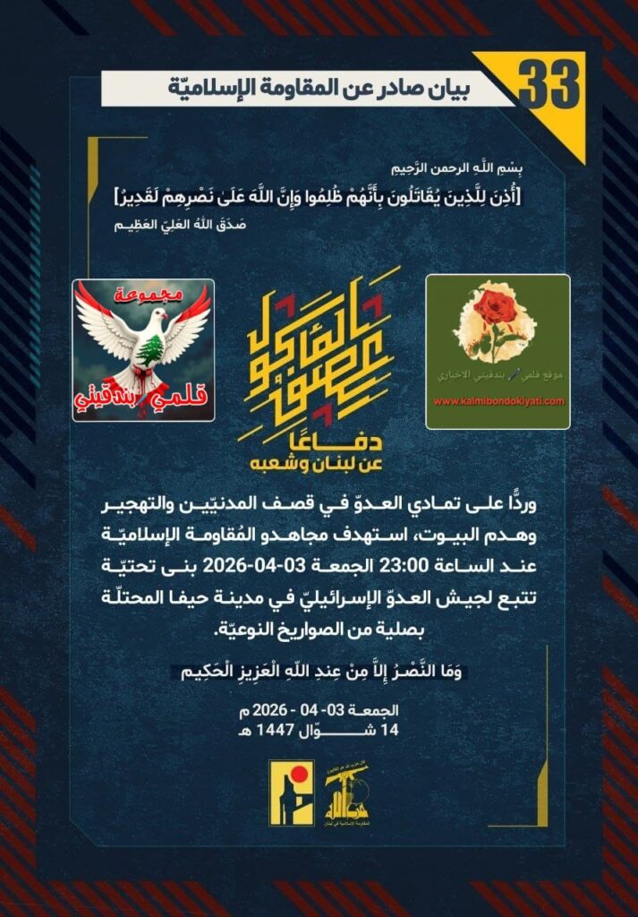 أصدرت المقاومة الاسلامية بعد البيان رقم “32” مباشرة بيان رقم “33” :”دفاعًا عن لبنان وشعبه، وردًّا على تمادي العدوّ في قصف المدنيّين والتهجير وهدم البيوت، استهدف مجاهدو المُقاومة الإسلاميّة عند الساعة 23:00 الجمعة 03-04-2026 بنى تحتيّة تتبع لجيش العدوّ الإسرائيليّ في مدينة حيفا المحتلّة بصلية من الصواريخ النوعيّة.