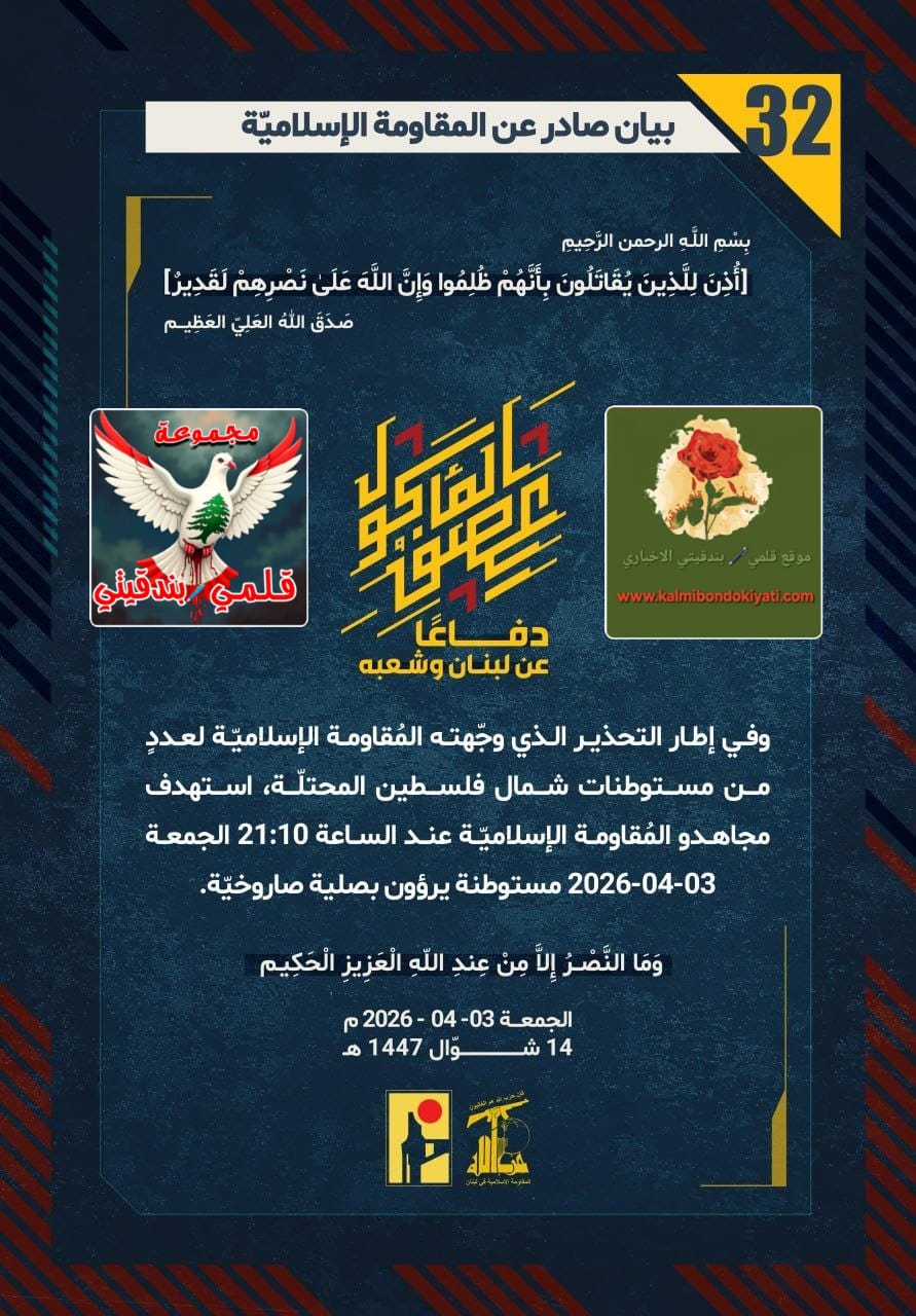 صدر بيان رقم “32” للمقاومة الاسلامية الآتي نصه:”دفاعًا عن لبنان وشعبه، وفي إطار ‏التحذير الذي وجّهته المُقاومة الإسلاميّة لعددٍ من مستوطنات شمال فلسطين المحتلّة، استهدف مجاهدو المُقاومة الإسلاميّة عند الساعة 21:10 الجمعة 03-04-2026 مستوطنة يرؤون بصلية صاروخيّة.