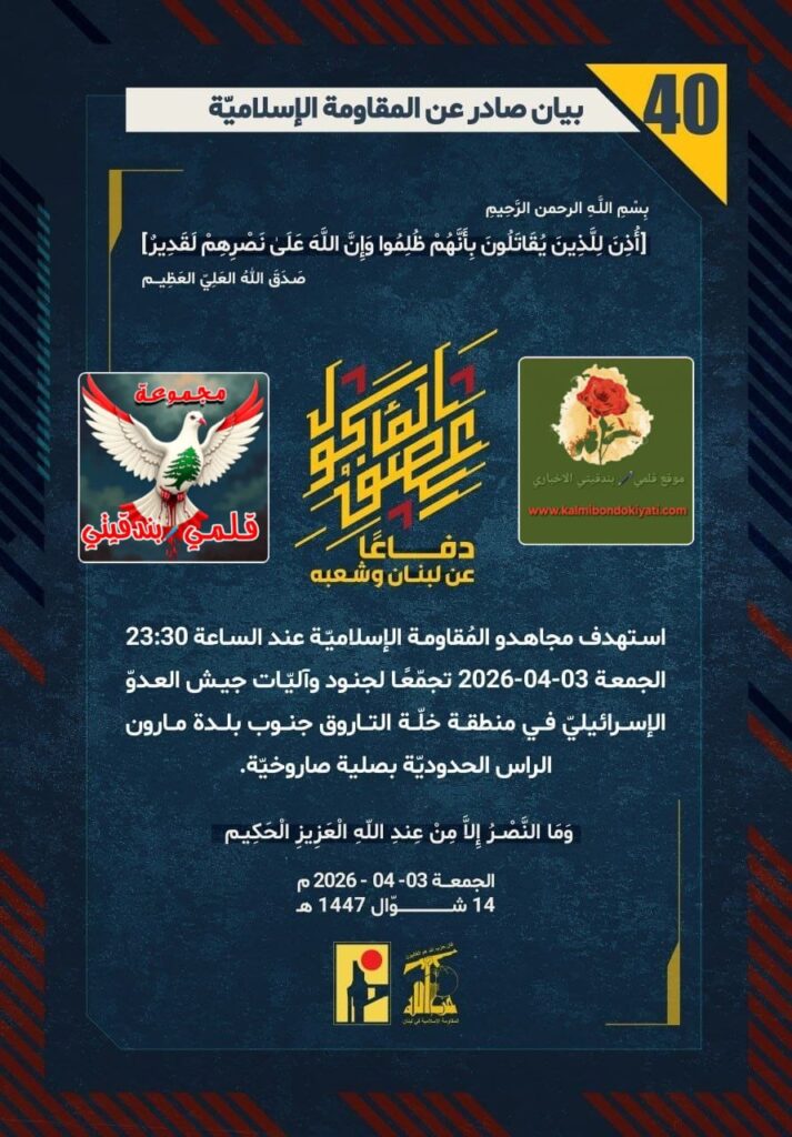 أصدرت المقاومة الاسلامية بعد البيان رقم (38 و 39) مباشرة بيان رقم “40” :”دفاعًا عن لبنان وشعبه، استهدف مجاهدو المُقاومة الإسلاميّة عند الساعة 23:30 الجمعة 03-04-2026 تجمّعًا لجنود وآليّات جيش العدوّ الإسرائيليّ في منطقة خلّة التاروق جنوب بلدة مارون الراس الحدوديّة بصلية صاروخيّة.