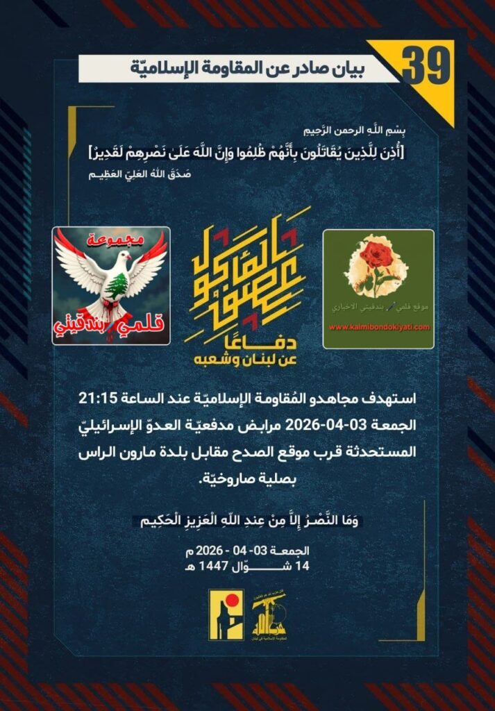 أصدرت المقاومة الاسلامية بعد البيان رقم “38” مباشرة بيان رقم “39” :”دفاعًا عن لبنان وشعبه، استهدف مجاهدو المُقاومة الإسلاميّة عند الساعة 21:15 الجمعة 03-04-2026 مرابض مدفعيّة العدوّ الإسرائيليّ المستحدثة قرب موقع الصدح مقابل بلدة مارون الراس بصلية صاروخيّة.