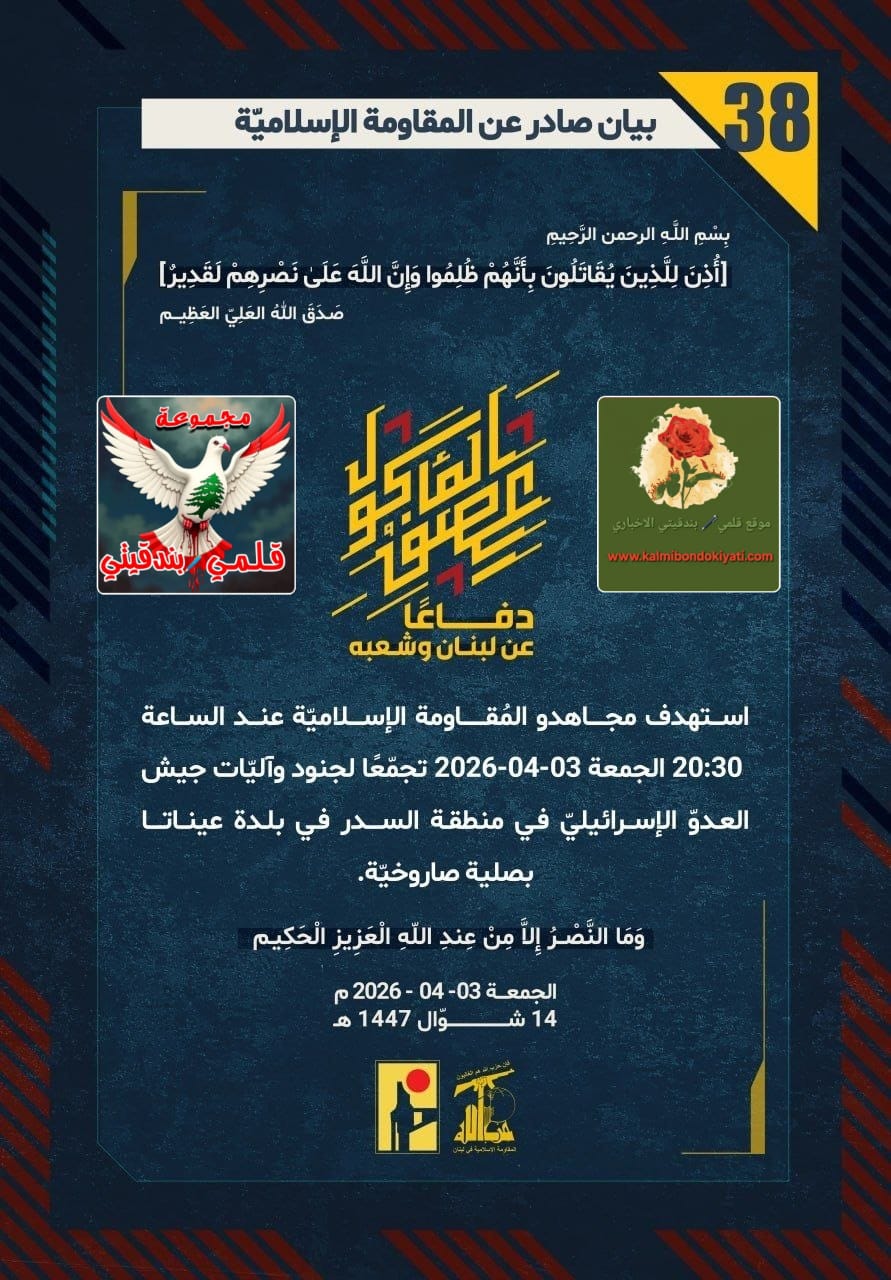 صدر بيان رقم “38” للمقاومة الاسلامية الآتي نصه:”دفاعًا عن لبنان وشعبه، استهدف مجاهدو المُقاومة الإسلاميّة عند الساعة 20:30 الجمعة 03-04-2026 تجمّعًا لجنود وآليّات جيش العدوّ الإسرائيليّ في منطقة السدر في بلدة عيناتا بصلية صاروخيّة.
