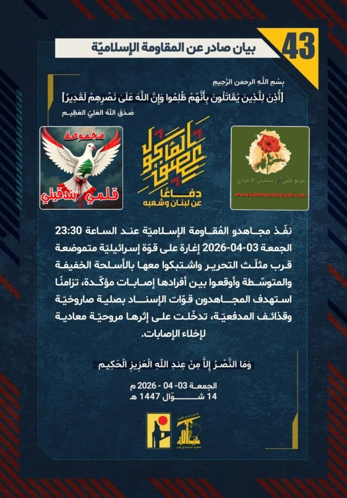 ุฃุตุฏุฑุช ุงู„ู…ู‚ุงูˆู…ุฉ ุงู„ุงุณู„ุงู…ูŠุฉ ุจุนุฏ ุงู„ุจูŠุงู† ุฑู‚ู… (41 ูˆ 42) ู…ุจุงุดุฑุฉ ุจูŠุงู† ุฑู‚ู… “43” :โ€ุฏูุงุนู‹ุง ุนู† ู„ุจู†ุงู† ูˆุดุนุจู‡ุŒ ู†ูู‘ุฐ ู…ุฌุงู‡ุฏูˆ ุงู„ู…ูู‚ุงูˆู…ุฉ ุงู„ุฅุณู„ุงู…ูŠู‘ุฉ ุนู†ุฏ ุงู„ุณุงุนุฉ 23:30 ุงู„ุฌู…ุนุฉ 03-04-2026 ุฅุบุงุฑุฉ ุนู„ู‰ ู‚ูˆู‘ุฉ ุฅุณุฑุงุฆูŠู„ูŠู‘ุฉ ู…ุชู…ูˆุถุนุฉ ู‚ุฑุจ ู…ุซู„ู‘ุซ ุงู„ุชุญุฑูŠุฑ ูˆุงุดุชุจูƒูˆุง ู…ุนู‡ุง ุจุงู„ุฃุณู„ุญุฉ ุงู„ุฎููŠูุฉ ูˆุงู„ู…ุชูˆุณู‘ุทุฉ ูˆุฃูˆู‚ุนูˆุง ุจูŠู† ุฃูุฑุงุฏู‡ุง ุฅุตุงุจุงุช ู…ุคูƒู‘ุฏุฉุŒ ุชุฒุงู…ู†ู‹ุง ุงุณุชู‡ุฏู ุงู„ู…ุฌุงู‡ุฏูˆู† ู‚ูˆู‘ุงุช ุงู„ุฅุณู†ุงุฏ ุจุตู„ูŠุฉ ุตุงุฑูˆุฎูŠู‘ุฉ ูˆู‚ุฐุงุฆู ุงู„ู…ุฏูุนูŠู‘ุฉุŒ ุชุฏุฎู‘ู„ุช ุนู„ู‰ ุฅุซุฑู‡ุง ู…ุฑูˆุญูŠู‘ุฉ ู…ุนุงุฏูŠุฉ ู„ุฅุฎู„ุงุก ุงู„ุฅุตุงุจุงุช.