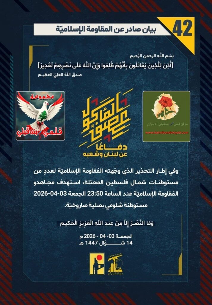 ุฃุตุฏุฑุช ุงู„ู…ู‚ุงูˆู…ุฉ ุงู„ุงุณู„ุงู…ูŠุฉ ุจุนุฏ ุงู„ุจูŠุงู† ุฑู‚ู… “41” ู…ุจุงุดุฑุฉ ุจูŠุงู† ุฑู‚ู… “42” :โ€ุฏูุงุนู‹ุง ุนู† ู„ุจู†ุงู† ูˆุดุนุจู‡ุŒ ูˆููŠ ุฅุทุงุฑ โ€ุงู„ุชุญุฐูŠุฑ ุงู„ุฐูŠ ูˆุฌู‘ู‡ุชู‡ ุงู„ู…ูู‚ุงูˆู…ุฉ ุงู„ุฅุณู„ุงู…ูŠู‘ุฉ ู„ุนุฏุฏู ู…ู† ู…ุณุชูˆุทู†ุงุช ุดู…ุงู„ ูู„ุณุทูŠู† ุงู„ู…ุญุชู„ุฉุŒ ุงุณุชู‡ุฏู ู…ุฌุงู‡ุฏูˆ ุงู„ู…ูู‚ุงูˆู…ุฉ ุงู„ุฅุณู„ุงู…ูŠู‘ุฉ ุนู†ุฏ ุงู„ุณุงุนุฉ 23:50 ุงู„ุฌู…ุนุฉ 03-04-2026 ู…ุณุชูˆุทู†ุฉ ุดู„ูˆู…ูŠ ุจุตู„ูŠุฉ ุตุงุฑูˆุฎูŠู‘ุฉ.