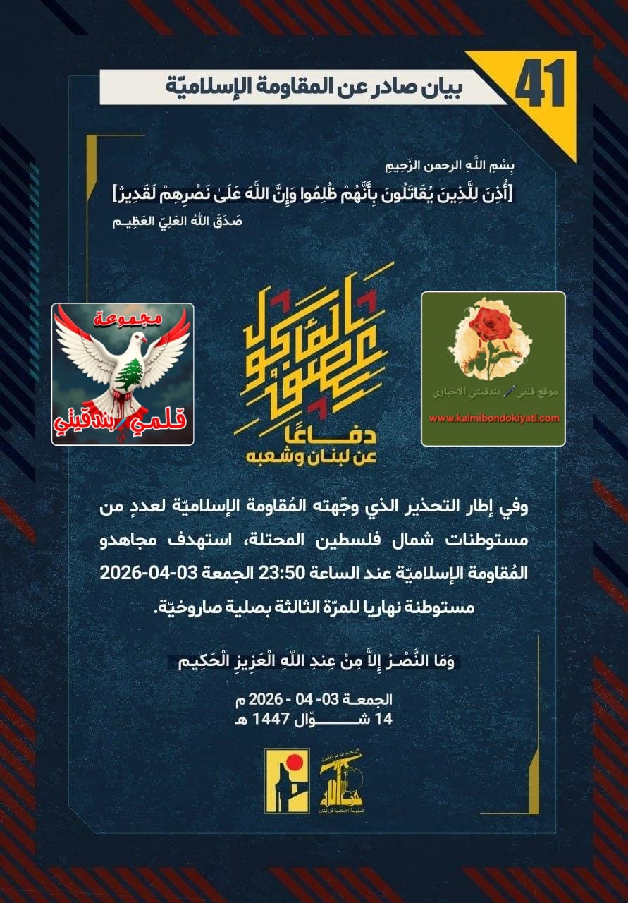 ุตุฏุฑ ุจูŠุงู† ุฑู‚ู… “41” ู„ู„ู…ู‚ุงูˆู…ุฉ ุงู„ุงุณู„ุงู…ูŠุฉ ุงู„ุขุชูŠ ู†ุตู‡:”ุฏูุงุนู‹ุง ุนู† ู„ุจู†ุงู† ูˆุดุนุจู‡ุŒ ูˆููŠ ุฅุทุงุฑ โ€ุงู„ุชุญุฐูŠุฑ ุงู„ุฐูŠ ูˆุฌู‘ู‡ุชู‡ ุงู„ู…ูู‚ุงูˆู…ุฉ ุงู„ุฅุณู„ุงู…ูŠู‘ุฉ ู„ุนุฏุฏู ู…ู† ู…ุณุชูˆุทู†ุงุช ุดู…ุงู„ ูู„ุณุทูŠู† ุงู„ู…ุญุชู„ุฉุŒ ุงุณุชู‡ุฏู ู…ุฌุงู‡ุฏูˆ ุงู„ู…ูู‚ุงูˆู…ุฉ ุงู„ุฅุณู„ุงู…ูŠู‘ุฉ ุนู†ุฏ ุงู„ุณุงุนุฉ 23:50 ุงู„ุฌู…ุนุฉ 03-04-2026 ู…ุณุชูˆุทู†ุฉ ู†ู‡ุงุฑูŠุง ู„ู„ู…ุฑู‘ุฉ ุงู„ุซุงู„ุซุฉ ุจุตู„ูŠุฉ ุตุงุฑูˆุฎูŠู‘ุฉ.