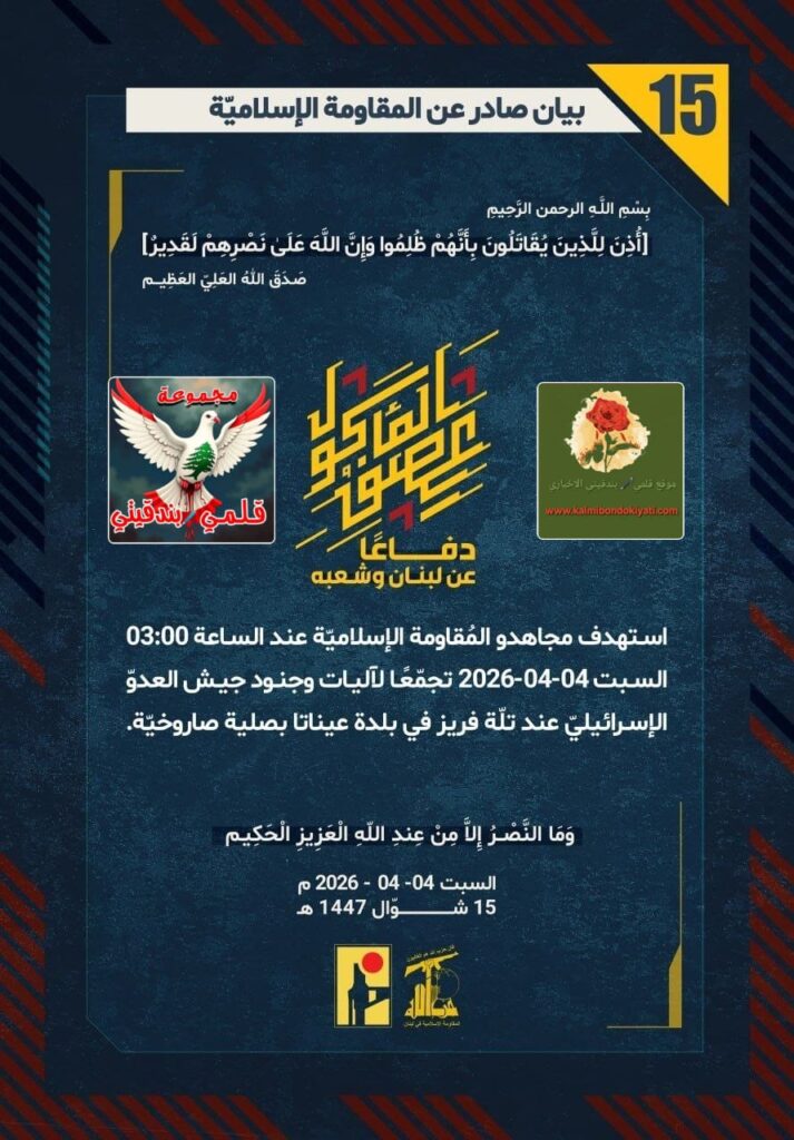 “دفاعًا عن لبنان وشعبه، استهدف مجاهدو المُقاومة الإسلاميّة عند الساعة 03:00 السبت 04-04-2026 تجمّعًا لآليات وجنود جيش العدوّ الإسرائيليّ عند تلّة فريز في بلدة عيناتا بصلية صاروخيّة.”