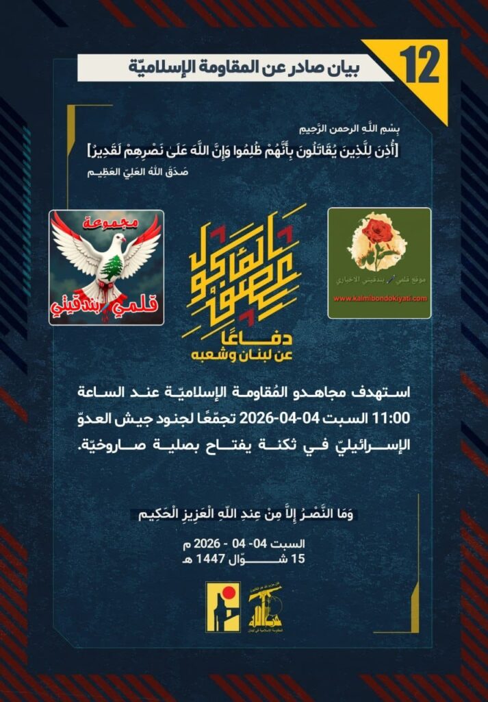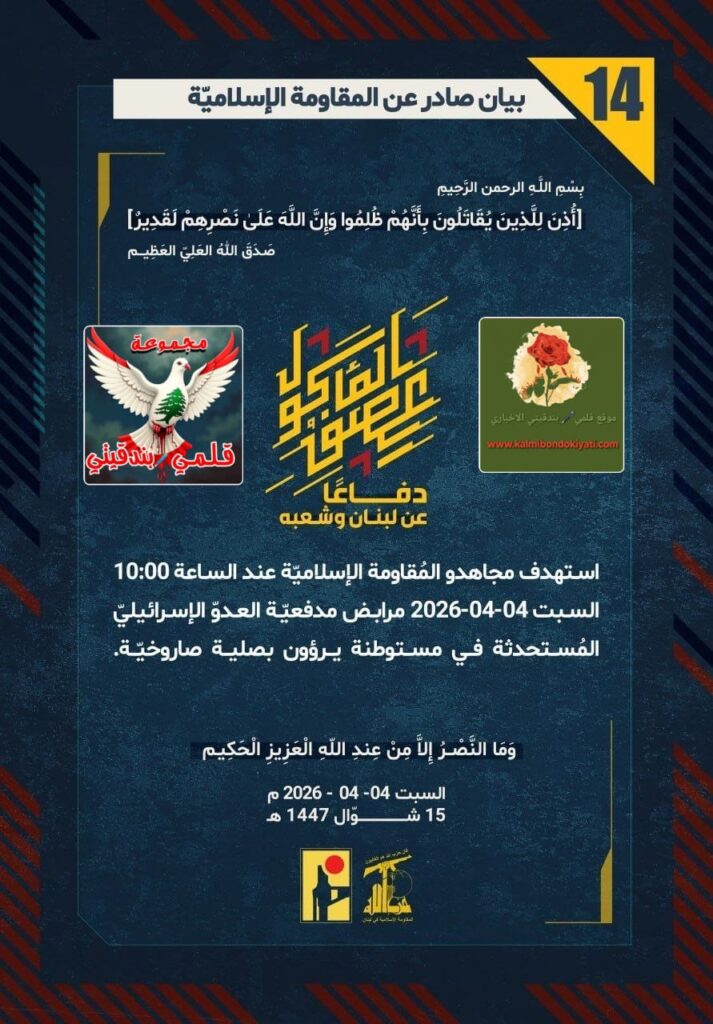 “دفاعًا عن لبنان وشعبه، استهدف مجاهدو المُقاومة الإسلاميّة عند الساعة 11:00 السبت 04-04-2026 تجمّعًا لجنود جيش العدوّ الإسرائيليّ في مستوطنة بيت هلل بصلية صاروخيّة.”