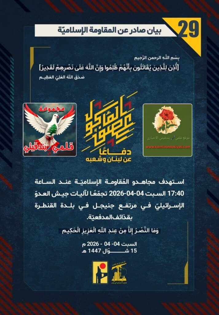 ุฃุตุฏุฑุช ุงูู ูุงูู ุฉ ุงูุงุณูุงู ูุฉ ุจุนุฏ ุงูุจูุงู ุฑูู (27 ู 28) ู ุจุงุดุฑุฉ ุจูุงู ุฑูู “29” :โุฏูุงุนูุง ุนู ูุจูุงู ูุดุนุจูุ ุงุณุชูุฏู ู ุฌุงูุฏู ุงูู ููุงูู ุฉ ุงูุฅุณูุงู ููุฉ ุนูุฏ ุงูุณุงุนุฉ 17:40 ุงูุณุจุช 04-04-2026 ุชุฌู ูุนูุง ูุขููุงุช ุฌูุด ุงูุนุฏูู ุงูุฅุณุฑุงุฆูููู ูู ู ุฑุชูุน ุฌููุฌู ูู ุจูุฏุฉ ุงูููุทุฑุฉ ุจูุฐุงุฆู ุงูู ุฏูุนููุฉ.