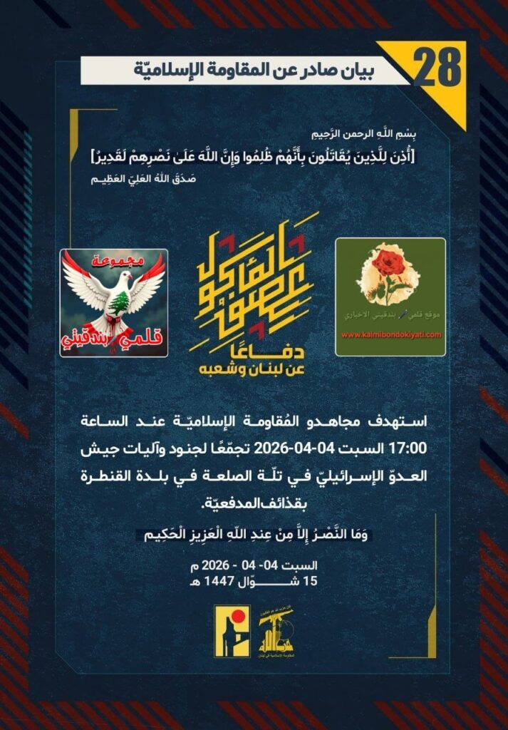 ุฃุตุฏุฑุช ุงูู ูุงูู ุฉ ุงูุงุณูุงู ูุฉ ุจุนุฏ ุงูุจูุงู ุฑูู “27” ู ุจุงุดุฑุฉ ุจูุงู ุฑูู “28” :โุฏูุงุนูุง ุนู ูุจูุงู ูุดุนุจูุ ุงุณุชูุฏู ู ุฌุงูุฏู ุงูู ููุงูู ุฉ ุงูุฅุณูุงู ููุฉ ุนูุฏ ุงูุณุงุนุฉ 17:00 ุงูุณุจุช 04-04-2026 ุชุฌู ูุนูุง ูุฌููุฏ ูุขููุงุช ุฌูุด ุงูุนุฏูู ุงูุฅุณุฑุงุฆูููู ูู ุชููุฉ ุงูุตูุนุฉ ูู ุจูุฏุฉ ุงูููุทุฑุฉ ุจูุฐุงุฆู ุงูู ุฏูุนููุฉ.