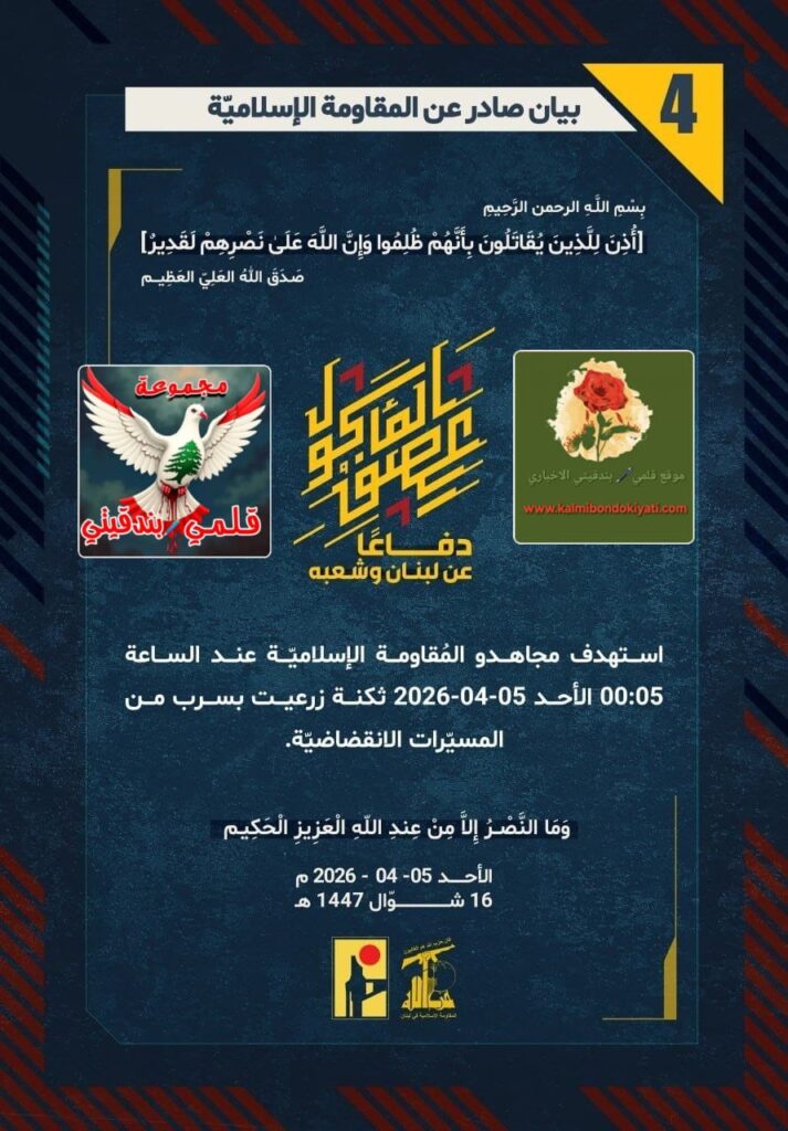 “دفاعًا عن لبنان وشعبه، استهدف مجاهدو المُقاومة الإسلاميّة عند الساعة 00:05 الأحد 05-04-2026 ثكنة زرعيت بسرب من المسيّرات الانقضاضيّة.”