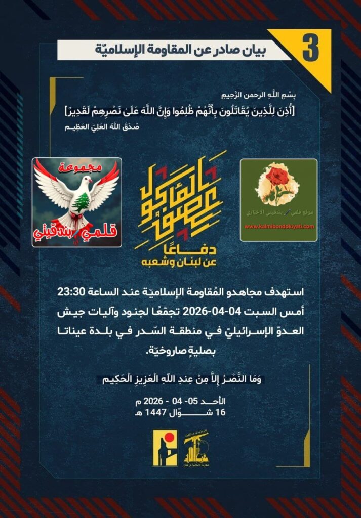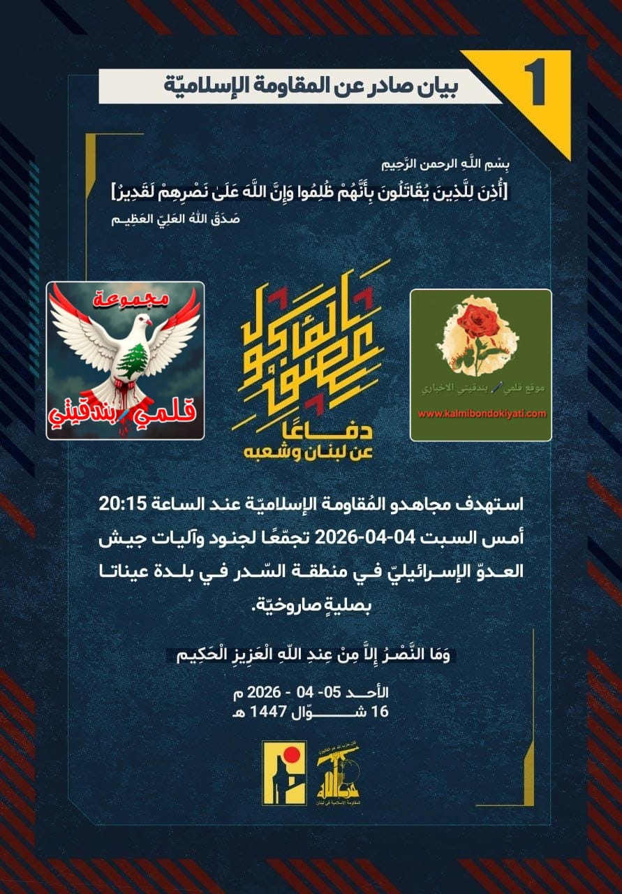 “دفاعًا عن لبنان وشعبه، استهدف مجاهدو المُقاومة الإسلاميّة عند الساعة 23:30 أمس السبت 04-04-2026 تجمّعًا لجنود وآليات جيش العدوّ الإسرائيليّ في منطقة السّدر في بلدة عيناتا بصليةٍ صاروخيّة.”
