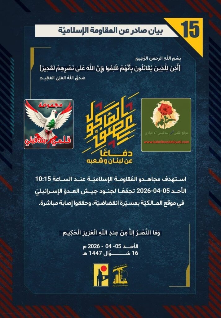 โ๐ ุตุฏุฑ ุจูุงู ุฑูู (15) ููู ูุงูู ุฉ ุงูุฅุณูุงู ูุฉ ุงูุขุชู ูุตู:”ุฏูุงุนูุง ุนู ูุจูุงู ูุดุนุจูุ ุงุณุชูุฏู ู ุฌุงูุฏู ุงูู ููุงูู ุฉ ุงูุฅุณูุงู ููุฉ ุนูุฏ ุงูุณุงุนุฉ 10:15 ุงูุฃุญุฏ 05-04-2026 ุชุฌู ูุนูุง ูุฌููุฏ ุฌูุด ุงูุนุฏูู ุงูุฅุณุฑุงุฆูููู ูู ู ููุน ุงูู ุงููููุฉ ุจู ุณููุฑุฉ ุงููุถุงุถููุฉุ ูุญูููุง ุฅุตุงุจุฉ ู ุจุงุดุฑุฉ.”