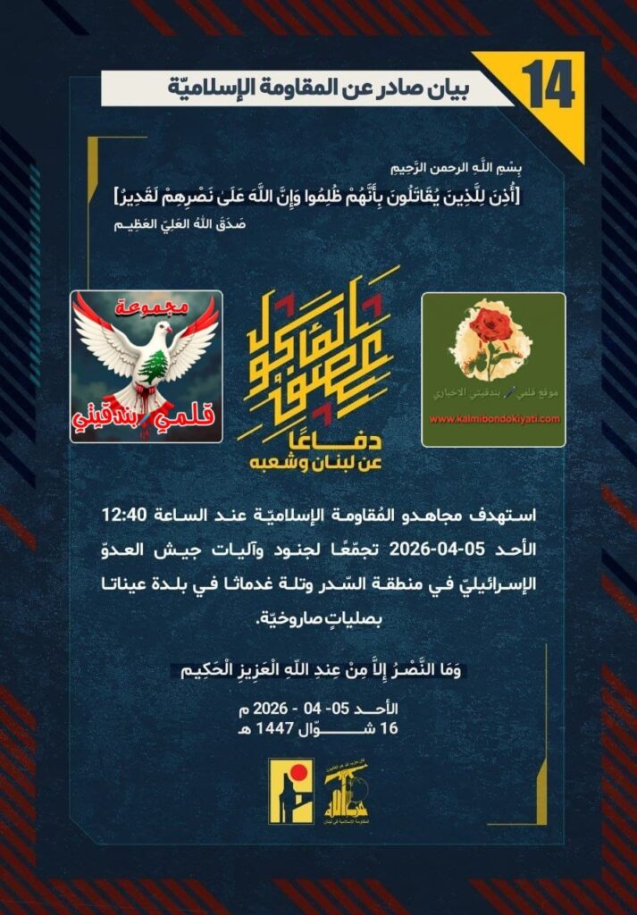 โ๐ ุตุฏุฑ ุจูุงู ุฑูู (14) ููู ูุงูู ุฉ ุงูุฅุณูุงู ูุฉ ุงูุขุชู ูุตู:”ุฏูุงุนูุง ุนู ูุจูุงู ูุดุนุจูุ ุงุณุชูุฏู ู ุฌุงูุฏู ุงูู ููุงูู ุฉ ุงูุฅุณูุงู ููุฉ ุนูุฏ ุงูุณุงุนุฉ 12:40 ุงูุฃุญุฏ 05-04-2026 ุชุฌู ูุนูุง ูุฌููุฏ ูุขููุงุช ุฌูุด ุงูุนุฏูู ุงูุฅุณุฑุงุฆูููู ูู ู ูุทูุฉ ุงูุณูุฏุฑ ูุชูุฉ ุบุฏู ุงุซุง ูู ุจูุฏุฉ ุนููุงุชุง ุจุตููุงุชู ุตุงุฑูุฎููุฉ.”