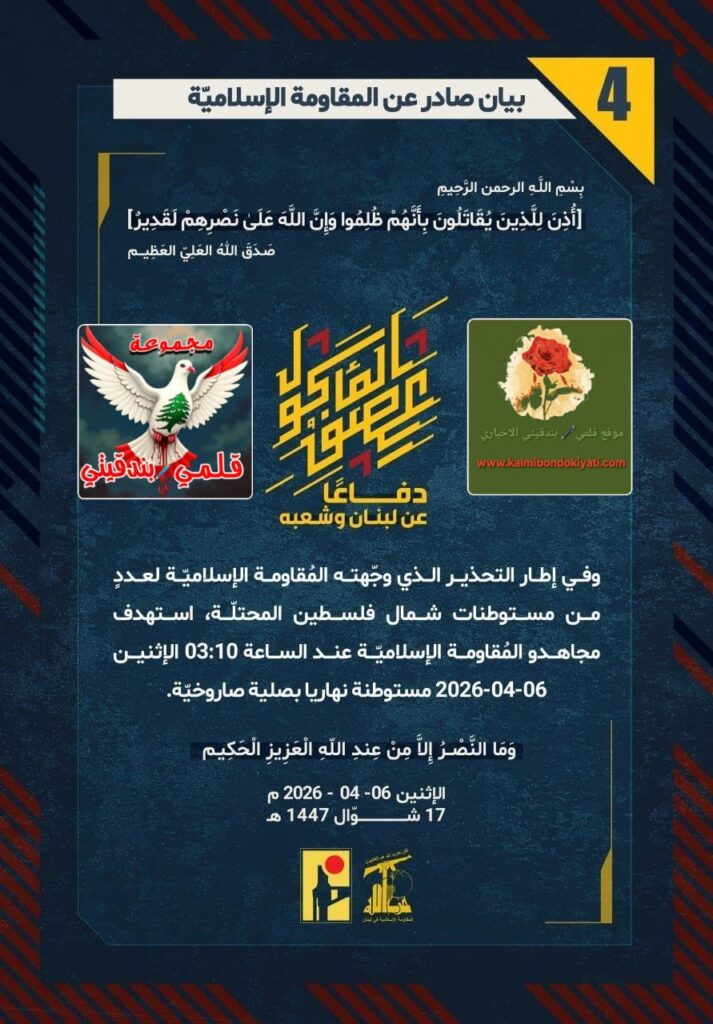 โ๐ ุตุฏุฑ ุจูุงู ุฑูู (4) ููู ูุงูู ุฉ ุงูุฅุณูุงู ูุฉ ุงูุขุชู ูุตู:”ุฏูุงุนูุง ุนู ูุจูุงู ูุดุนุจูุ ููู ุฅุทุงุฑ โุงูุชุญุฐูุฑ ุงูุฐู ูุฌููุชู ุงูู ููุงูู ุฉ ุงูุฅุณูุงู ููุฉ ูุนุฏุฏู ู ู ู ุณุชูุทูุงุช ุดู ุงู ููุณุทูู ุงูู ุญุชููุฉุ ุงุณุชูุฏู ู ุฌุงูุฏู ุงูู ููุงูู ุฉ ุงูุฅุณูุงู ููุฉ ุนูุฏ ุงูุณุงุนุฉ 03:10 ุงูุฅุซููู 06-04-2026 ู ุณุชูุทูุฉ ููุงุฑูุง ุจุตููุฉ ุตุงุฑูุฎููุฉ.”