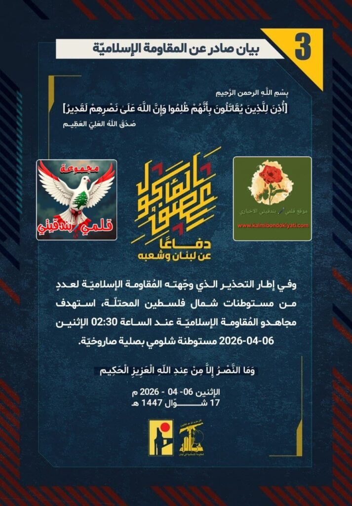 โ๐ ุตุฏุฑ ุจูุงู ุฑูู (3) ููู ูุงูู ุฉ ุงูุฅุณูุงู ูุฉ ุงูุขุชู ูุตู:”ุฏูุงุนูุง ุนู ูุจูุงู ูุดุนุจูุ ููู ุฅุทุงุฑ โุงูุชุญุฐูุฑ ุงูุฐู ูุฌููุชู ุงูู ููุงูู ุฉ ุงูุฅุณูุงู ููุฉ ูุนุฏุฏู ู ู ู ุณุชูุทูุงุช ุดู ุงู ููุณุทูู ุงูู ุญุชููุฉุ ุงุณุชูุฏู ู ุฌุงูุฏู ุงูู ููุงูู ุฉ ุงูุฅุณูุงู ููุฉ ุนูุฏ ุงูุณุงุนุฉ 02:30 ุงูุฅุซููู 06-04-2026 ู ุณุชูุทูุฉ ุดููู ู ุจุตููุฉ ุตุงุฑูุฎููุฉ.”