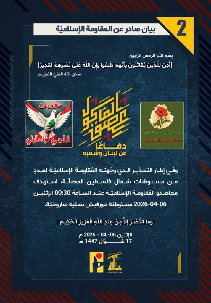 โ๐ ุตุฏุฑ ุจูุงู ุฑูู (2) ููู ูุงูู ุฉ ุงูุฅุณูุงู ูุฉ ุงูุขุชู ูุตู:”ุฏูุงุนูุง ุนู ูุจูุงู ูุดุนุจูุ ููู ุฅุทุงุฑ โุงูุชุญุฐูุฑ ุงูุฐู ูุฌููุชู ุงูู ููุงูู ุฉ ุงูุฅุณูุงู ููุฉ ูุนุฏุฏู ู ู ู ุณุชูุทูุงุช ุดู ุงู ููุณุทูู ุงูู ุญุชููุฉุ ุงุณุชูุฏู ู ุฌุงูุฏู ุงูู ููุงูู ุฉ ุงูุฅุณูุงู ููุฉ ุนูุฏ ุงูุณุงุนุฉ 00:30 ุงูุฅุซููู 06-04-2026 ู ุณุชูุทูุฉ ุญูุฑููุด ุจุตููุฉ ุตุงุฑูุฎููุฉ.”