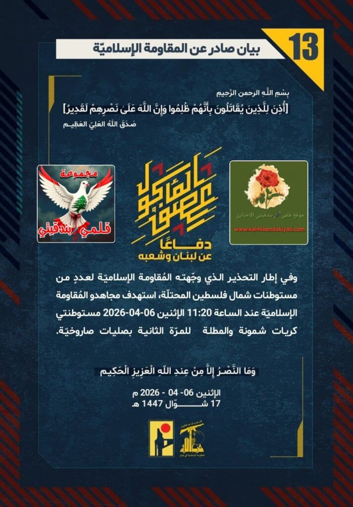 ุฃุตุฏุฑุช ุงูู ูุงูู ุฉ ุงูุงุณูุงู ูุฉ ุจุนุฏ ุงูุจูุงู ุฑูู (11 ู 12) ู ุจุงุดุฑุฉ ุจูุงู ุฑูู “13” :โุฏูุงุนูุง ุนู ูุจูุงู ูุดุนุจูุ ููู ุฅุทุงุฑ โุงูุชุญุฐูุฑ ุงูุฐู ูุฌููุชู ุงูู ููุงูู ุฉ ุงูุฅุณูุงู ููุฉ ูุนุฏุฏู ู ู ู ุณุชูุทูุงุช ุดู ุงู ููุณุทูู ุงูู ุญุชููุฉุ ุงุณุชูุฏู ู ุฌุงูุฏู ุงูู ููุงูู ุฉ ุงูุฅุณูุงู ููุฉ ุนูุฏ ุงูุณุงุนุฉ 11:20 ุงูุฅุซููู 06-04-2026 ู ุณุชูุทูุชู ูุฑูุงุช ุดู ููุฉ ูุงูู ุทูุฉ ููู ุฑูุฉ ุงูุซุงููุฉ ุจุตููุงุช ุตุงุฑูุฎููุฉ.