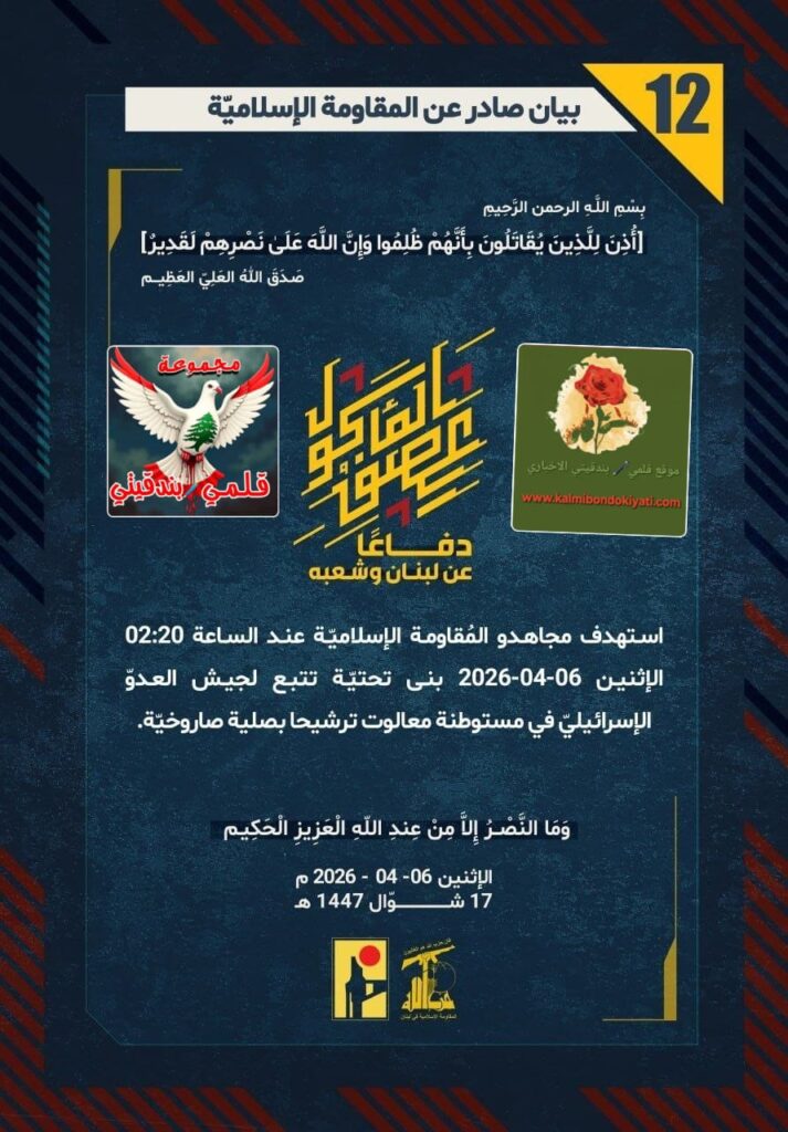 ุฃุตุฏุฑุช ุงูู ูุงูู ุฉ ุงูุงุณูุงู ูุฉ ุจุนุฏ ุงูุจูุงู ุฑูู “11” ู ุจุงุดุฑุฉ ุจูุงู ุฑูู “12” :โุฏูุงุนูุง ุนู ูุจูุงู ูุดุนุจูุ ุงุณุชูุฏู ู ุฌุงูุฏู ุงูู ููุงูู ุฉ ุงูุฅุณูุงู ููุฉ ุนูุฏ ุงูุณุงุนุฉ 02:20 ุงูุฅุซููู 06-04-2026 ุจูู ุชุญุชููุฉ ุชุชุจุน ูุฌูุด ุงูุนุฏูู ุงูุฅุณุฑุงุฆูููู ูู ู ุณุชูุทูุฉ ู ุนุงููุช ุชุฑุดูุญุง ุจุตููุฉ ุตุงุฑูุฎููุฉ.