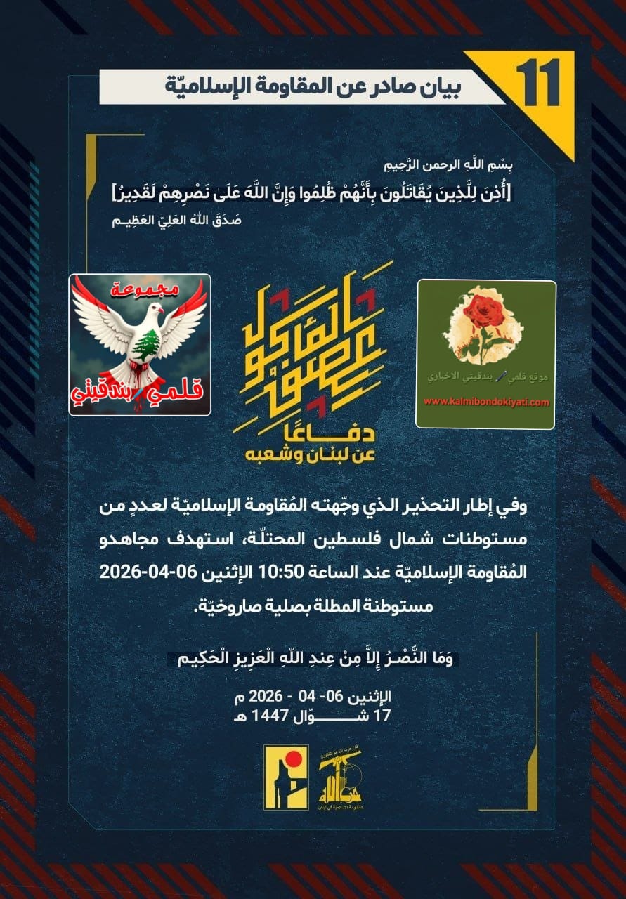 ุตุฏุฑ ุจูุงู ุฑูู “11” ููู ูุงูู ุฉ ุงูุงุณูุงู ูุฉ ุงูุขุชู ูุตู:”ุฏูุงุนูุง ุนู ูุจูุงู ูุดุนุจูุ ููู ุฅุทุงุฑ โุงูุชุญุฐูุฑ ุงูุฐู ูุฌููุชู ุงูู ููุงูู ุฉ ุงูุฅุณูุงู ููุฉ ูุนุฏุฏู ู ู ู ุณุชูุทูุงุช ุดู ุงู ููุณุทูู ุงูู ุญุชููุฉุ ุงุณุชูุฏู ู ุฌุงูุฏู ุงูู ููุงูู ุฉ ุงูุฅุณูุงู ููุฉ ุนูุฏ ุงูุณุงุนุฉ 10:50 ุงูุฅุซููู 06-04-2026 ู ุณุชูุทูุฉ ุงูู ุทูุฉ ุจุตููุฉ ุตุงุฑูุฎููุฉ.