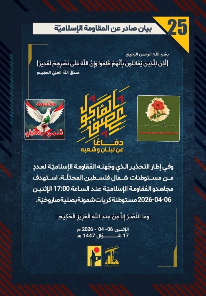 ๐ โุตุฏุฑ ุจูุงู ุฑูู (25) ููู ูุงูู ุฉ ุงูุฅุณูุงู ูุฉ ุงูุขุชู ูุตู:ุฏูุงุนูุง ุนู ูุจูุงู ูุดุนุจูุ ููู ุฅุทุงุฑ โุงูุชุญุฐูุฑ ุงูุฐู ูุฌููุชู ุงูู ููุงูู ุฉ ุงูุฅุณูุงู ููุฉ ูุนุฏุฏู ู ู ู ุณุชูุทูุงุช ุดู ุงู ููุณุทูู ุงูู ุญุชููุฉุ ุงุณุชูุฏู ู ุฌุงูุฏู ุงูู ููุงูู ุฉ ุงูุฅุณูุงู ููุฉ ุนูุฏ ุงูุณุงุนุฉ 17:00 ุงูุฅุซููู 06-04-2026 ู ุณุชูุทูุฉ ูุฑูุงุช ุดู ููุฉ ุจุตููุฉ ุตุงุฑูุฎููุฉ.