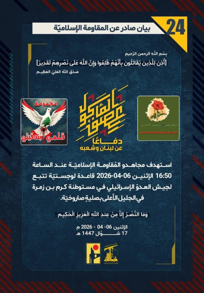 ๐ โุตุฏุฑ ุจูุงู ุฑูู (24) ููู ูุงูู ุฉ ุงูุฅุณูุงู ูุฉ ุงูุขุชู ูุตู:ุฏูุงุนูุง ุนู ูุจูุงู ูุดุนุจูุ ุงุณุชูุฏู ู ุฌุงูุฏู ุงูู ููุงูู ุฉ ุงูุฅุณูุงู ููุฉ ุนูุฏ ุงูุณุงุนุฉ 16:50 ุงูุฅุซููู 06-04-2026 ูุงุนุฏุฉ ููุฌุณุชููุฉ ุชุชุจุน ูุฌูุด ุงูุนุฏูู ุงูุฅุณุฑุงุฆููู ูู ู ุณุชูุทูุฉ ูุฑู ุจู ุฒู ุฑุฉ ูู ุงูุฌููู ุงูุฃุนูู ุจุตููุฉู ุตุงุฑูุฎููุฉ.