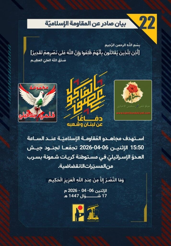 ๐โุตุฏุฑ ุจูุงู ุฑูู (22) ููู ูุงูู ุฉ ุงูุฅุณูุงู ูุฉ ุงูุขุชู ูุตู: ุฏูุงุนูุง ุนู ูุจูุงู ูุดุนุจูุ ุงุณุชูุฏู ู ุฌุงูุฏู ุงูู ููุงูู ุฉ ุงูุฅุณูุงู ููุฉ ุนูุฏ ุงูุณุงุนุฉ 15:50 ุงูุฅุซููู 06-04-2026 ุชุฌู ูุนุง ูุฌููุฏ ุฌูุด ุงูุนุฏูู ุงูุฅุณุฑุงุฆูููู ูู ู ุณุชูุทูุฉ ูุฑูุงุช ุดู ููุฉ ุจุณุฑุจ ู ู ุงูู ุณููุฑุงุช ุงูุงููุถุงุถูุฉ.