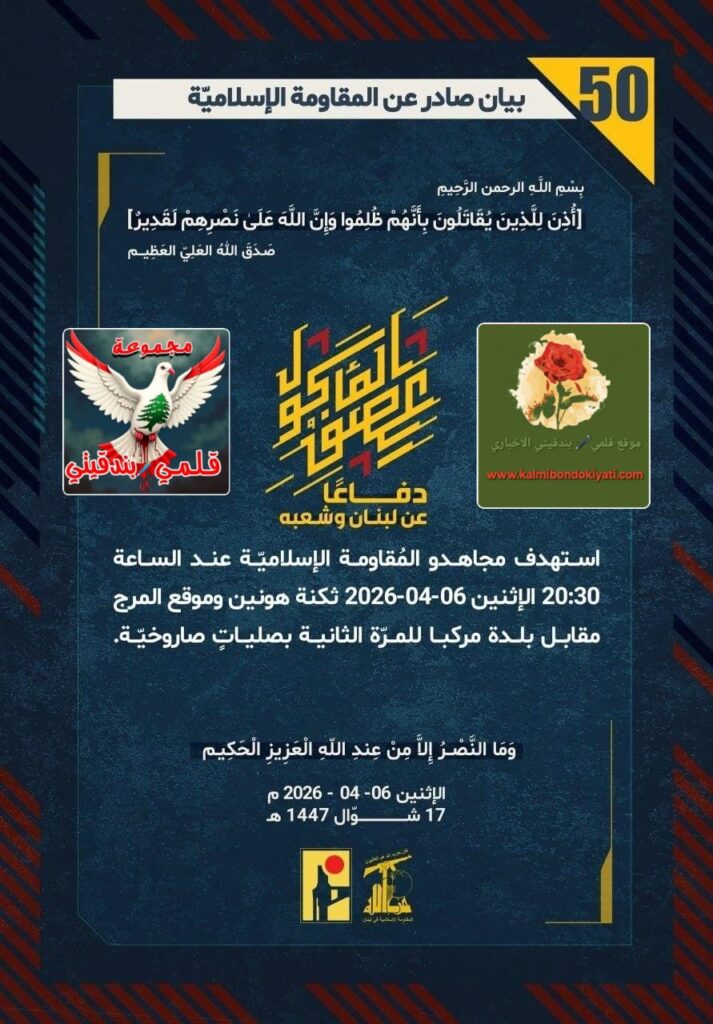 โ€‹๐Ÿ›‘ ุตุฏุฑ ุจูŠุงู† ุฑู‚ู… (50) ู„ู„ู…ู‚ุงูˆู…ุฉ ุงู„ุฅุณู„ุงู…ูŠุฉ ุงู„ุขุชูŠ ู†ุตู‡:”ุฏูุงุนู‹ุง ุนู† ู„ุจู†ุงู† ูˆุดุนุจู‡ุŒ ุงุณุชู‡ุฏู ู…ุฌุงู‡ุฏูˆ ุงู„ู…ูู‚ุงูˆู…ุฉ ุงู„ุฅุณู„ุงู…ูŠู‘ุฉ ุนู†ุฏ ุงู„ุณุงุนุฉ 20:30 ุงู„ุฅุซู†ูŠู† 06-04-2026 ุซูƒู†ุฉ ู‡ูˆู†ูŠู† ูˆู…ูˆู‚ุน ุงู„ู…ุฑุฌ ู…ู‚ุงุจู„ ุจู„ุฏุฉ ู…ุฑูƒุจุง ู„ู„ู…ุฑู‘ุฉ ุงู„ุซุงู†ูŠุฉ ุจุตู„ูŠุงุชู ุตุงุฑูˆุฎูŠู‘ุฉ.”