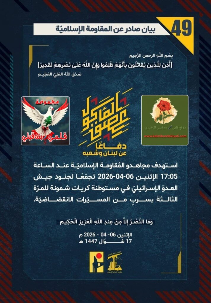 โ€‹๐Ÿ›‘ ุตุฏุฑ ุจูŠุงู† ุฑู‚ู… (49) ู„ู„ู…ู‚ุงูˆู…ุฉ ุงู„ุฅุณู„ุงู…ูŠุฉ ุงู„ุขุชูŠ ู†ุตู‡:”ุฏูุงุนู‹ุง ุนู† ู„ุจู†ุงู† ูˆุดุนุจู‡ุŒ ุงุณุชู‡ุฏู ู…ุฌุงู‡ุฏูˆ ุงู„ู…ูู‚ุงูˆู…ุฉ ุงู„ุฅุณู„ุงู…ูŠู‘ุฉ ุนู†ุฏ ุงู„ุณุงุนุฉ 17:05 ุงู„ุฅุซู†ูŠู† 06-04-2026 ุชุฌู…ู‘ุนู‹ุง ู„ุฌู†ูˆุฏ ุฌูŠุด ุงู„ุนุฏูˆู‘ ุงู„ุฅุณุฑุงุฆูŠู„ูŠู‘ ููŠ ู…ุณุชูˆุทู†ุฉ ูƒุฑูŠุงุช ุดู…ูˆู†ุฉ ู„ู„ู…ุฑู‘ุฉ ุงู„ุซุงู„ุซุฉ ุจุณุฑุจู ู…ู† ุงู„ู…ุณูŠู‘ุฑุงุช ุงู„ุงู†ู‚ุถุงุถูŠู‘ุฉ.”