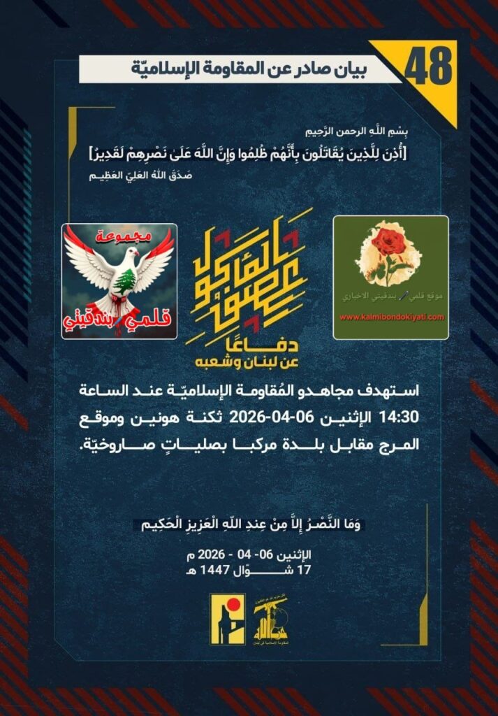 โ€‹๐Ÿ›‘ ุตุฏุฑ ุจูŠุงู† ุฑู‚ู… (48) ู„ู„ู…ู‚ุงูˆู…ุฉ ุงู„ุฅุณู„ุงู…ูŠุฉ ุงู„ุขุชูŠ ู†ุตู‡:”ุฏูุงุนู‹ุง ุนู† ู„ุจู†ุงู† ูˆุดุนุจู‡ุŒ ุงุณุชู‡ุฏู ู…ุฌุงู‡ุฏูˆ ุงู„ู…ูู‚ุงูˆู…ุฉ ุงู„ุฅุณู„ุงู…ูŠู‘ุฉ ุนู†ุฏ ุงู„ุณุงุนุฉ 14:30 ุงู„ุฅุซู†ูŠู† 06-04-2026 ุซูƒู†ุฉ ู‡ูˆู†ูŠู† ูˆู…ูˆู‚ุน ุงู„ู…ุฑุฌ ู…ู‚ุงุจู„ ุจู„ุฏุฉ ู…ุฑูƒุจุง ุจุตู„ูŠุงุชู ุตุงุฑูˆุฎูŠู‘ุฉ.”