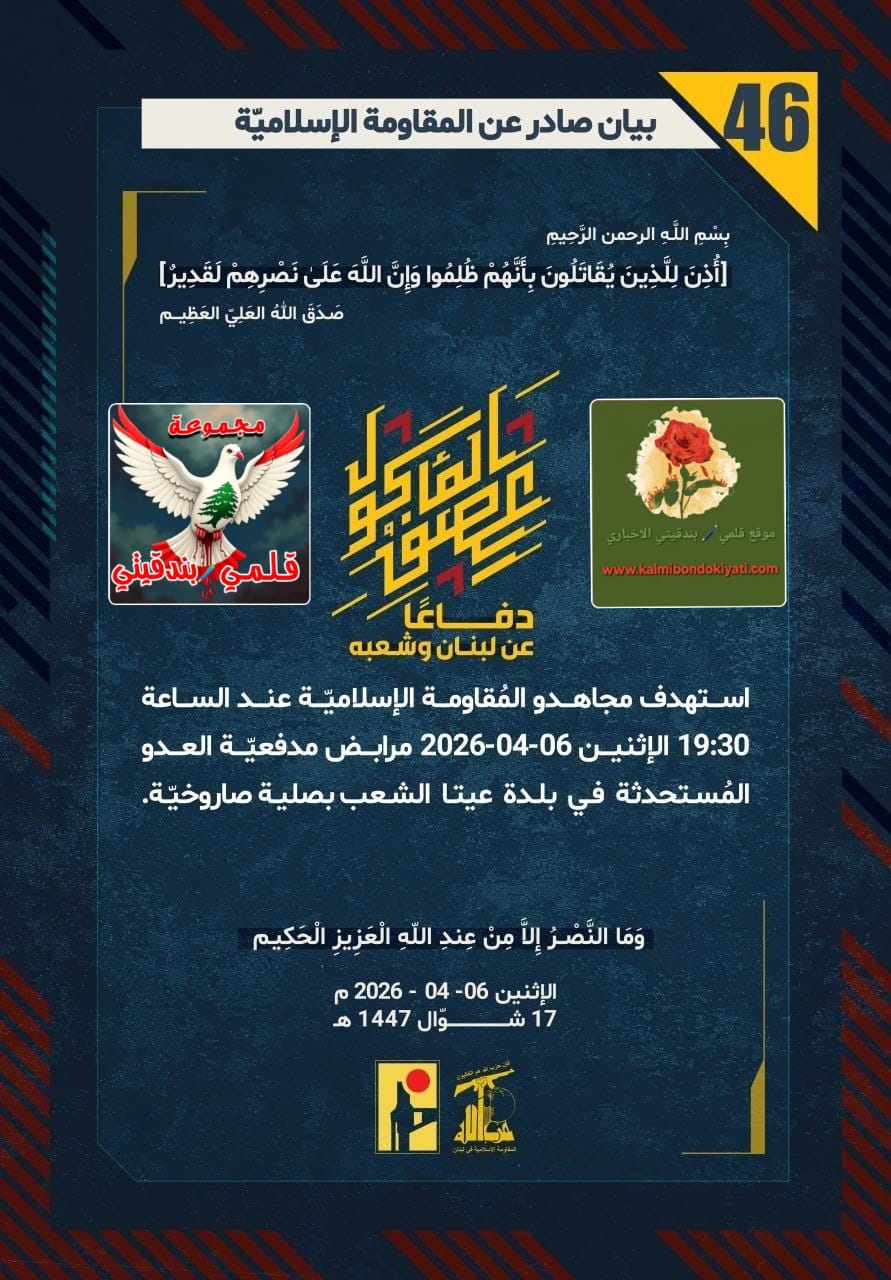 โ€‹๐Ÿ›‘ ุตุฏุฑ ุจูŠุงู† ุฑู‚ู… (46) ู„ู„ู…ู‚ุงูˆู…ุฉ ุงู„ุฅุณู„ุงู…ูŠุฉ ุงู„ุขุชูŠ ู†ุตู‡:”ุฏูุงุนู‹ุง ุนู† ู„ุจู†ุงู† ูˆุดุนุจู‡ุŒ ุงุณุชู‡ุฏู ู…ุฌุงู‡ุฏูˆ ุงู„ู…ูู‚ุงูˆู…ุฉ ุงู„ุฅุณู„ุงู…ูŠู‘ุฉ ุนู†ุฏ ุงู„ุณุงุนุฉ 19:30 ุงู„ุฅุซู†ูŠู† 06-04-2026 ู…ุฑุงุจุถ ู…ุฏูุนูŠู‘ุฉ ุงู„ุนุฏูˆ ุงู„ู…ูุณุชุญุฏุซุฉ ููŠ ุจู„ุฏุฉ ุนูŠุชุง ุงู„ุดุนุจ ุจุตู„ูŠุฉ ุตุงุฑูˆุฎูŠู‘ุฉ.”