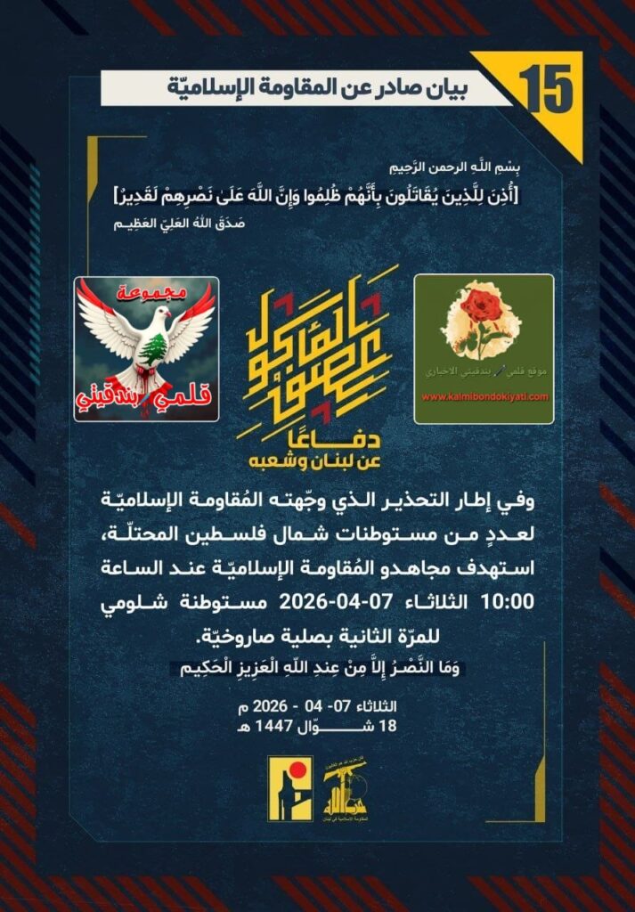 โ๐ ุตุฏุฑ ุจูุงู ุฑูู (15) ููู ูุงูู ุฉ ุงูุฅุณูุงู ูุฉ ุงูุขุชู ูุตู:”ุฏูุงุนูุง ุนู ูุจูุงู ูุดุนุจูุ ููู ุฅุทุงุฑ โุงูุชุญุฐูุฑ ุงูุฐู ูุฌููุชู ุงูู ููุงูู ุฉ ุงูุฅุณูุงู ููุฉ ูุนุฏุฏู ู ู ู ุณุชูุทูุงุช ุดู ุงู ููุณุทูู ุงูู ุญุชููุฉุ ุงุณุชูุฏู ู ุฌุงูุฏู ุงูู ููุงูู ุฉ ุงูุฅุณูุงู ููุฉ ุนูุฏ ุงูุณุงุนุฉ 10:00 ุงูุซูุงุซุงุก 07-04-2026 ู ุณุชูุทูุฉ ุดููู ู ููู ุฑูุฉ ุงูุซุงููุฉ ุจุตููุฉ ุตุงุฑูุฎููุฉ.”