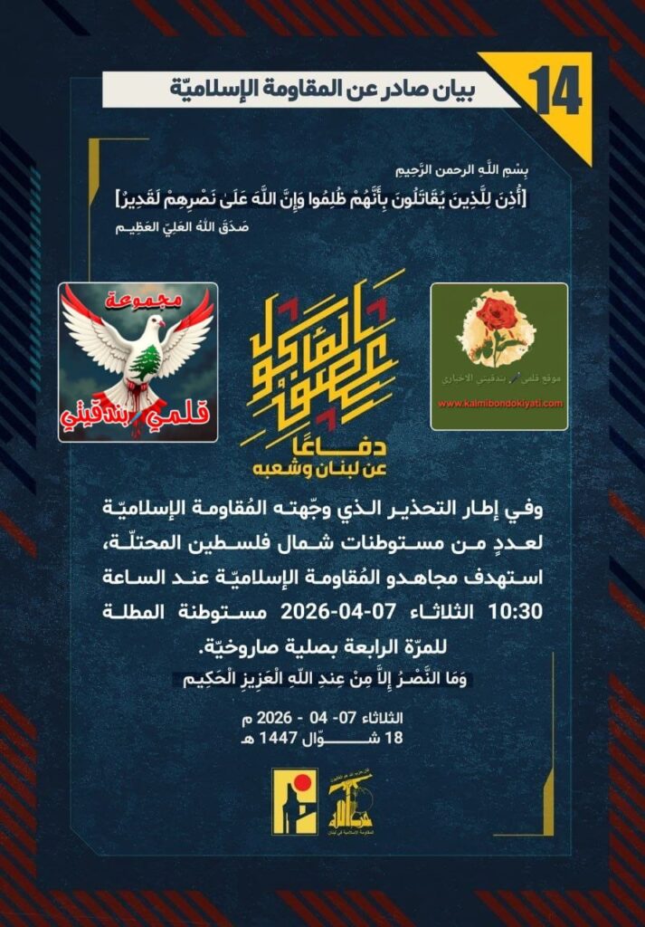 โ๐ ุตุฏุฑ ุจูุงู ุฑูู (14) ููู ูุงูู ุฉ ุงูุฅุณูุงู ูุฉ ุงูุขุชู ูุตู:”ุฏูุงุนูุง ุนู ูุจูุงู ูุดุนุจูุ ููู ุฅุทุงุฑ โุงูุชุญุฐูุฑ ุงูุฐู ูุฌููุชู ุงูู ููุงูู ุฉ ุงูุฅุณูุงู ููุฉ ูุนุฏุฏู ู ู ู ุณุชูุทูุงุช ุดู ุงู ููุณุทูู ุงูู ุญุชููุฉุ ุงุณุชูุฏู ู ุฌุงูุฏู ุงูู ููุงูู ุฉ ุงูุฅุณูุงู ููุฉ ุนูุฏ ุงูุณุงุนุฉ 10:30 ุงูุซูุงุซุงุก 07-04-2026 ู ุณุชูุทูุฉ ุงูู ุทูุฉ ููู ุฑูุฉ ุงูุฑุงุจุนุฉ ุจุตููุฉ ุตุงุฑูุฎููุฉ.”