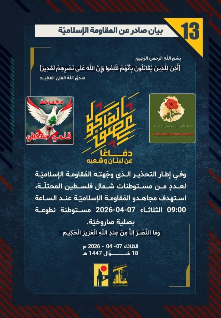 โ๐ ุตุฏุฑ ุจูุงู ุฑูู (13) ููู ูุงูู ุฉ ุงูุฅุณูุงู ูุฉ ุงูุขุชู ูุตู:”ุฏูุงุนูุง ุนู ูุจูุงู ูุดุนุจูุ ููู ุฅุทุงุฑ โุงูุชุญุฐูุฑ ุงูุฐู ูุฌููุชู ุงูู ููุงูู ุฉ ุงูุฅุณูุงู ููุฉ ูุนุฏุฏู ู ู ู ุณุชูุทูุงุช ุดู ุงู ููุณุทูู ุงูู ุญุชููุฉุ ุงุณุชูุฏู ู ุฌุงูุฏู ุงูู ููุงูู ุฉ ุงูุฅุณูุงู ููุฉ ุนูุฏ ุงูุณุงุนุฉ 09:00 ุงูุซูุงุซุงุก 07-04-2026 ู ุณุชูุทูุฉ ูุทูุนุฉ ุจุตููุฉ ุตุงุฑูุฎููุฉ.”