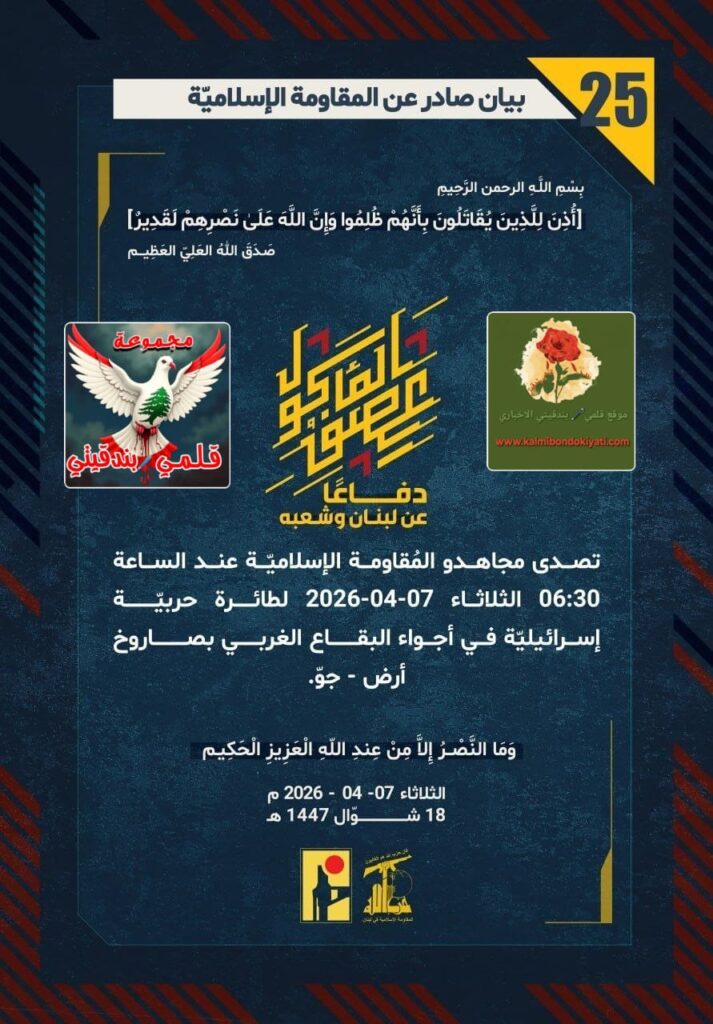 🛑 صدر بيان رقم (25) للمقاومة الإسلامية الآتي نصه:”دفاعًا عن لبنان وشعبه، تصدى مجاهدو المُقاومة الإسلاميّة عند الساعة 06:30 الثلاثاء 07-04-2026 لطائرة حربيّة إسرائيليّة في أجواء البقاع الغربي بصاروخ أرض – جوّ.”