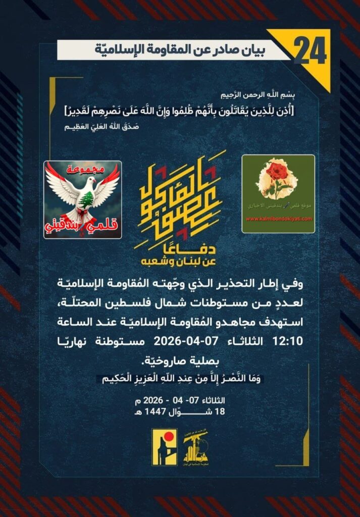 🛑 صدر بيان رقم (24) للمقاومة الإسلامية الآتي نصه:”دفاعًا عن لبنان وشعبه، وفي إطار التحذير الذي وجّهته المُقاومة الإسلاميّة لعددٍ من مستوطنات شمال فلسطين المحتلّة، استهدف مجاهدو المُقاومة الإسلاميّة عند الساعة 12:10 الثلاثاء 07-04-2026 مستوطنة نهاريّا بصلية صاروخيّة.”