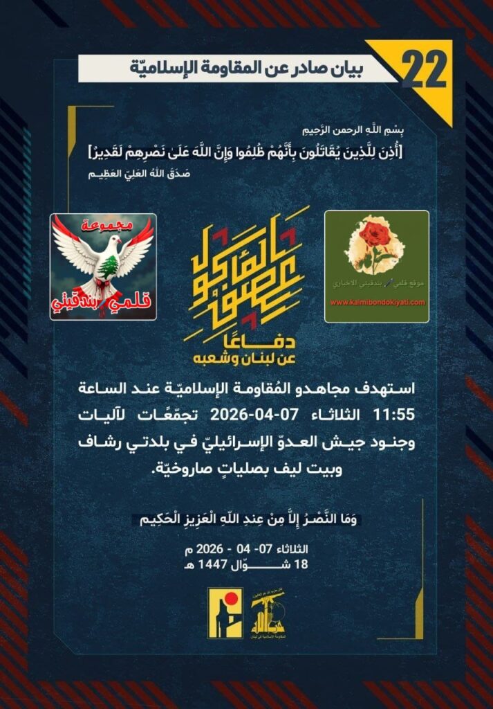 🛑 صدر بيان رقم (22) للمقاومة الإسلامية الآتي نصه:”دفاعًا عن لبنان وشعبه، استهدف مجاهدو المُقاومة الإسلاميّة عند الساعة 11:55 الثلاثاء 07-04-2026 تجمّعًات لآليات وجنود جيش العدوّ الإسرائيليّ في بلدتي رشاف وبيت ليف بصلياتٍ صاروخيّة.”
